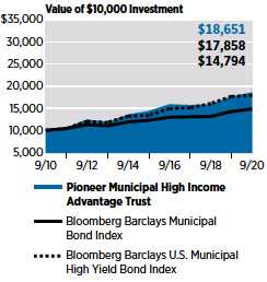 A    Pioneer Municipal High Income Advantage Trust returned 5.59% at net asset value (NAV) and 9.82% at market price during the six-month period ended September 30, 2020. During the same six-month period, the Trust’s benchmarks, the Bloomberg Barclays U.S. Municipal High Yield Bond Index and the Bloomberg Barclays Municipal Bond Index, returned 7.78% and 3.99% at NAV, respectively. The Bloomberg Barclays U.S. Municipal High Yield Bond Index is an unmanaged measure of the performance of lower-rated municipal bonds, while the Bloomberg Barclays Municipal Bond Index is an unmanaged measure of the performance of investment-grade municipal bonds. Unlike the Trust, the two indices do not use leverage. While use of leverage increases investment opportunity, it also increases investment risk.