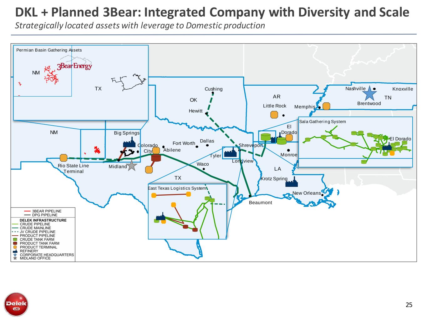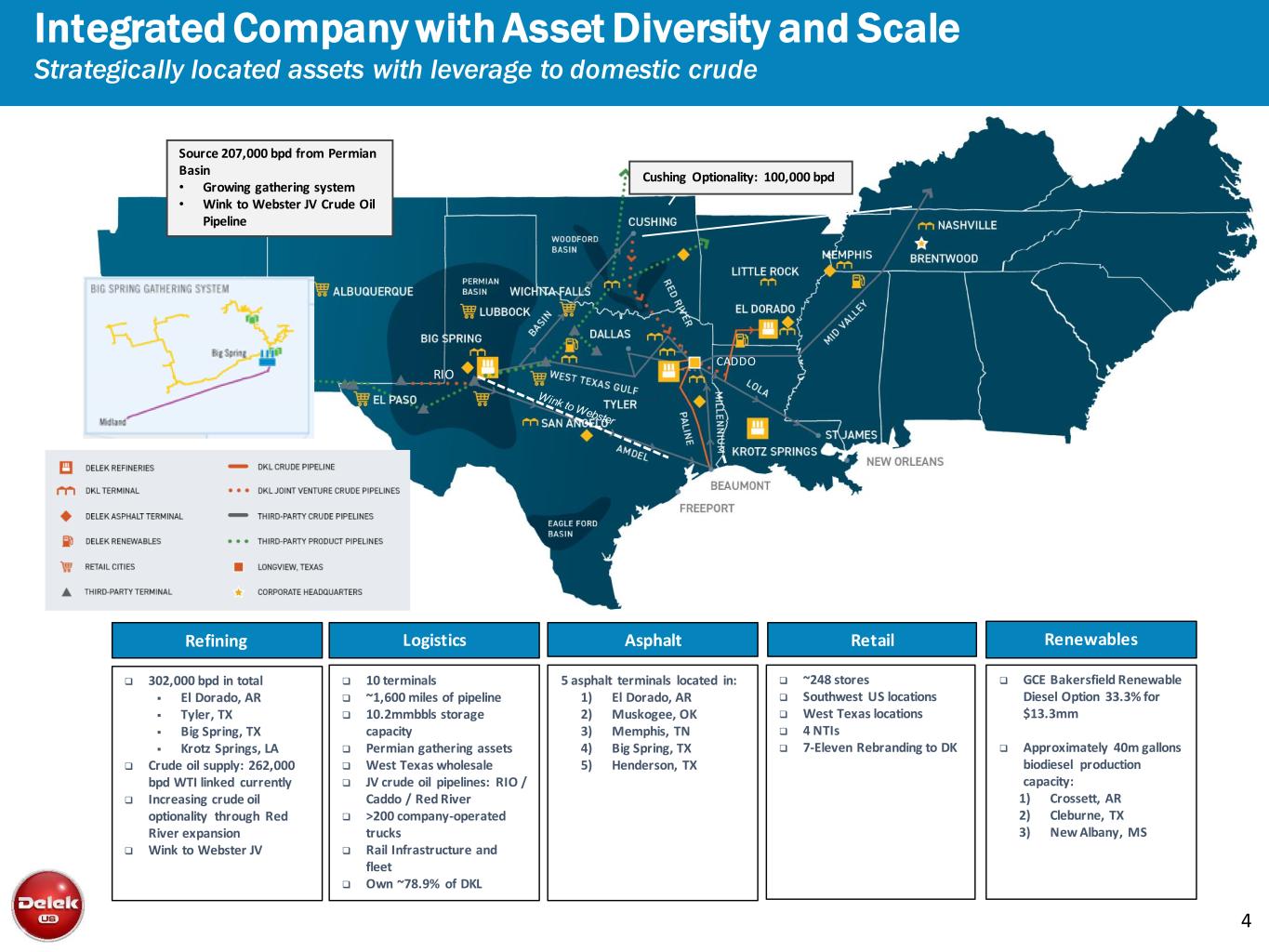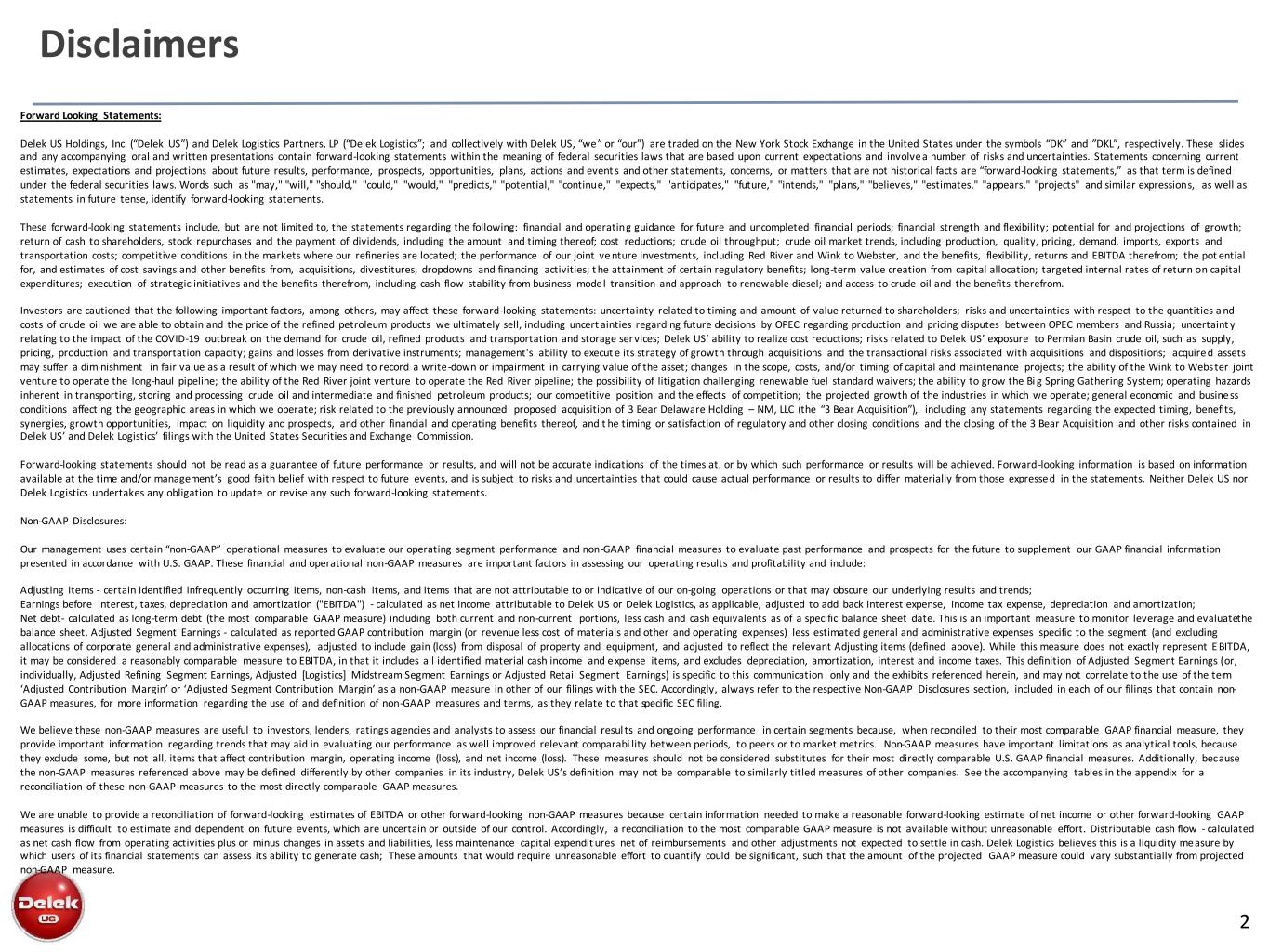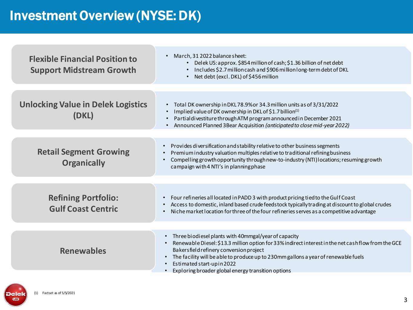 Disclaimers 2 Forward Looking Statements: Delek US Holdings, Inc. (“Delek US”) and Delek Logistics Partners, LP (“Delek Logistics”; and collectively with Delek US, “we” or “our”) are traded on the New York Stock Exchange in the United States under the symbols “DK” and ”DKL”, respectively. These slides and any accompanying oral and written presentations contain forward-looking statements within the meaning of federal securities laws that are based upon current expectations and involve a number of risks and uncertainties. Statements concerning current estimates, expectations and projections about future results, performance, prospects, opportunities, plans, actions and event s and other statements, concerns, or matters that are not historical facts are “forward-looking statements,” as that term is defined under the federal securities laws. Words such as "may," "will," "should," "could," "would," "predicts," "potential," "continue," "expects," "anticipates," "future," "intends," "plans," "believes," "estimates," "appears," "projects" and similar expressions, as well as statements in future tense, identify forward-looking statements. These forward-looking statements include, but are not limited to, the statements regarding the following: financial and operating guidance for future and uncompleted financial periods; financial strength and flexibility; potential for and projections of growth; return of cash to shareholders, stock repurchases and the payment of dividends, including the amount and timing thereof; cost reductions; crude oil throughput; crude oil market trends, including production, quality, pricing, demand, imports, exports and transportation costs; competitive conditions in the markets where our refineries are located; the performance of our joint ve nture investments, including Red River and Wink to Webster, and the benefits, flexibility, returns and EBITDA therefrom; the pot ential for, and estimates of cost savings and other benefits from, acquisitions, divestitures, dropdowns and financing activities; t he attainment of certain regulatory benefits; long-term value creation from capital allocation; targeted internal rates of return on capital expenditures; execution of strategic initiatives and the benefits therefrom, including cash flow stability from business mode l transition and approach to renewable diesel; and access to crude oil and the benefits therefrom. Investors are cautioned that the following important factors, among others, may affect these forward-looking statements: uncertainty related to timing and amount of value returned to shareholders; risks and uncertainties with respect to the quantities a nd costs of crude oil we are able to obtain and the price of the refined petroleum products we ultimately sell, including uncert ainties regarding future decisions by OPEC regarding production and pricing disputes between OPEC members and Russia; uncertaint y relating to the impact of the COVID-19 outbreak on the demand for crude oil, refined products and transportation and storage ser vices; Delek US’ ability to realize cost reductions; risks related to Delek US’ exposure to Permian Basin crude oil, such as supply, pricing, production and transportation capacity; gains and losses from derivative instruments; management's ability to execut e its strategy of growth through acquisitions and the transactional risks associated with acquisitions and dispositions; acquired assets may suffer a diminishment in fair value as a result of which we may need to record a write-down or impairment in carrying value of the asset; changes in the scope, costs, and/or timing of capital and maintenance projects; the ability of the Wink to Webster joint venture to operate the long-haul pipeline; the ability of the Red River joint venture to operate the Red River pipeline; the possibility of litigation challenging renewable fuel standard waivers; the ability to grow the Bi g Spring Gathering System; operating hazards inherent in transporting, storing and processing crude oil and intermediate and finished petroleum products; our competitive position and the effects of competition; the projected growth of the industries in which we operate; general economic and busine ss conditions affecting the geographic areas in which we operate; risk related to the previously announced proposed acquisition of 3 Bear Delaware Holding – NM, LLC (the “3 Bear Acquisition”), including any statements regarding the expected timing, benefits, synergies, growth opportunities, impact on liquidity and prospects, and other financial and operating benefits thereof, and t he timing or satisfaction of regulatory and other closing conditions and the closing of the 3 Bear Acquisition and other risks contained in Delek US’ and Delek Logistics’ filings with the United States Securities and Exchange Commission. Forward-looking statements should not be read as a guarantee of future performance or results, and will not be accurate indications of the times at, or by which such performance or results will be achieved. Forward-looking information is based on information available at the time and/or management’s good faith belief with respect to future events, and is subject to risks and uncertainties that could cause actual performance or results to differ materially from those expressed in the statements. Neither Delek US nor Delek Logistics undertakes any obligation to update or revise any such forward-looking statements. Non-GAAP Disclosures: Our management uses certain “non-GAAP” operational measures to evaluate our operating segment performance and non-GAAP financial measures to evaluate past performance and prospects for the future to supplement our GAAP financial information presented in accordance with U.S. GAAP. These financial and operational non-GAAP measures are important factors in assessing our operating results and profitability and include: Adjusting items - certain 