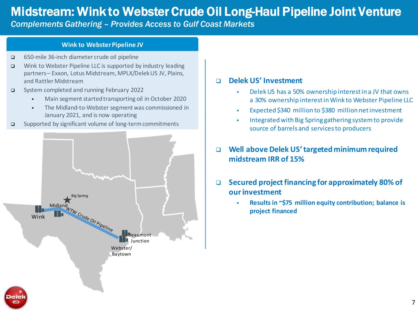 6 Midstream: Permian Gathering System Gathering Helps Control Crude Oil Quality and Cost into Refineries Permian Gathering System ❑ Approximately 200-mile gathering system ❑ 350 Kbpd throughput capacity ❑ >300,000 dedicated acres expected in 2022 ❑ Points of origin: Howard, Borden, Martin and Midland counties ❑ Total terminal storage of 650K bbls ❑ Connection to Big Spring, TX terminal ❑ Getting closer to wellhead allows us to control crude quality and cost ▪ Provides improvement in refining performance and cost structure ❑ Drop down to DKL completed in Q1 2020 ❑ Gathering increases access to barrels ▪ Creates optionality to place barrels: ❖ Big Spring (local refinery) ❖ Midland ❖ Colorado City (access other refineries) ❖ Wink (to Gulf Coast) ▪ Control quality and blending opportunities Delek Logistics Acquired 1Q20 ❑ CAPEX in 2022 ~$59 million ❑ $28 million comprised in DK MVC ❑ Balance focused toward 3rd party ❑ $34 - $36 million expected annualized EBITDA underpinned by MVC DK to DKL ❑ Currently 123kbpd MVC for Permian Gathering System in addition to 50kbpd MVC for a 3rd party interconnect Growth in DPG