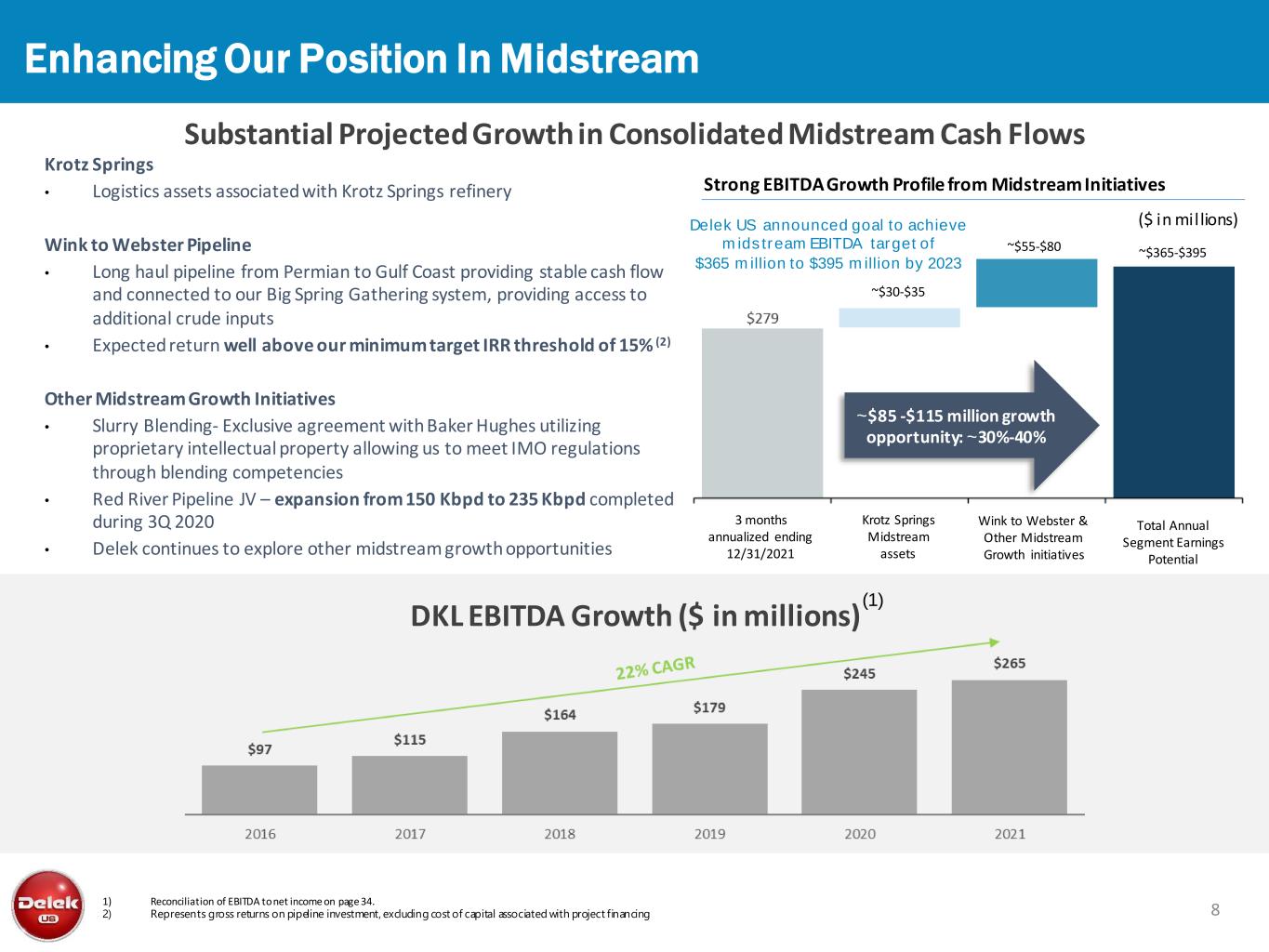 7 ❑ Delek US’ Investment ▪ Delek US has a 50% ownership interest in a JV that owns a 30% ownership interest in Wink to Webster Pipeline LLC ▪ Expected $340 million to $380 million net investment ▪ Integrated with Big Spring gathering system to provide source of barrels and services to producers ❑ Well above Delek US’ targeted minimum required midstream IRR of 15% ❑ Secured project financing for approximately 80% of our investment ▪ Results in ~$75 million equity contribution; balance is project financed Midstream: Wink to Webster Crude Oil Long-Haul Pipeline Joint Venture Complements Gathering – Provides Access to Gulf Coast Markets Big Spring Midland Beaumont Junction Webster/ Baytown Wink ❑ 650-mile 36-inch diameter crude oil pipeline ❑ Wink to Webster Pipeline LLC is supported by industry leading partners – Exxon, Lotus Midstream, MPLX/Delek US JV, Plains, and Rattler Midstream ❑ System completed and running February 2022 ▪ Main segment started transporting oil in October 2020 ▪ The Midland-to-Webster segment was commissioned in January 2021, and is now operating ❑ Supported by significant volume of long-term commitments Wink to Webster Pipeline JV