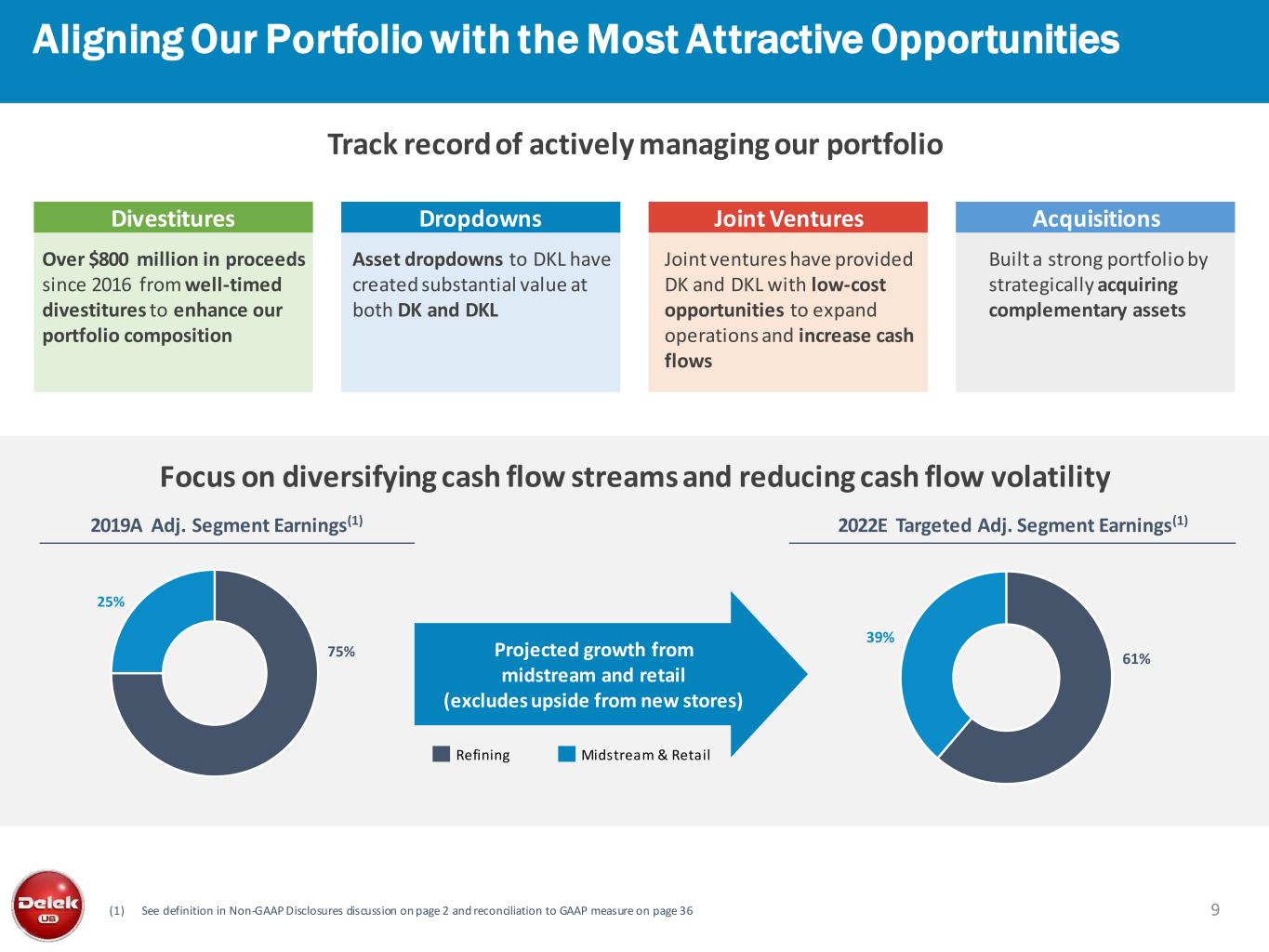 8 Enhancing Our Position In Midstream Krotz Springs • Logistics assets associated with Krotz Springs refinery Wink to Webster Pipeline • Long haul pipeline from Permian to Gulf Coast providing stable cash flow and connected to our Big Spring Gathering system, providing access to additional crude inputs • Expected return well above our minimum target IRR threshold of 15% (2) Other Midstream Growth Initiatives • Slurry Blending- Exclusive agreement with Baker Hughes utilizing proprietary intellectual property allowing us to meet IMO regulations through blending competencies • Red River Pipeline JV – expansion from 150 Kbpd to 235 Kbpd completed during 3Q 2020 • Delek continues to explore other midstream growth opportunities Substantial Projected Growth in Consolidated Midstream Cash Flows DKL EBITDA Growth ($ in millions) ~$85 -$115 million growth opportunity: ~30%-40% ($ in millions) Strong EBITDA Growth Profile from Midstream Initiatives Delek US announced goal to achieve midstream EBITDA target of $365 million to $395 million by 2023 3 months annualized ending 12/31/2021 Krotz Springs Midstream assets Wink to Webster & Other Midstream Growth initiatives Total Annual Segment Earnings Potential ~$30-$35 ~$55-$80 ~$365-$395 (1) 1) Reconciliation of EBITDA to net income on page 34. 2) Represents gross returns on pipeline investment, excluding cost of capital associated with project financing