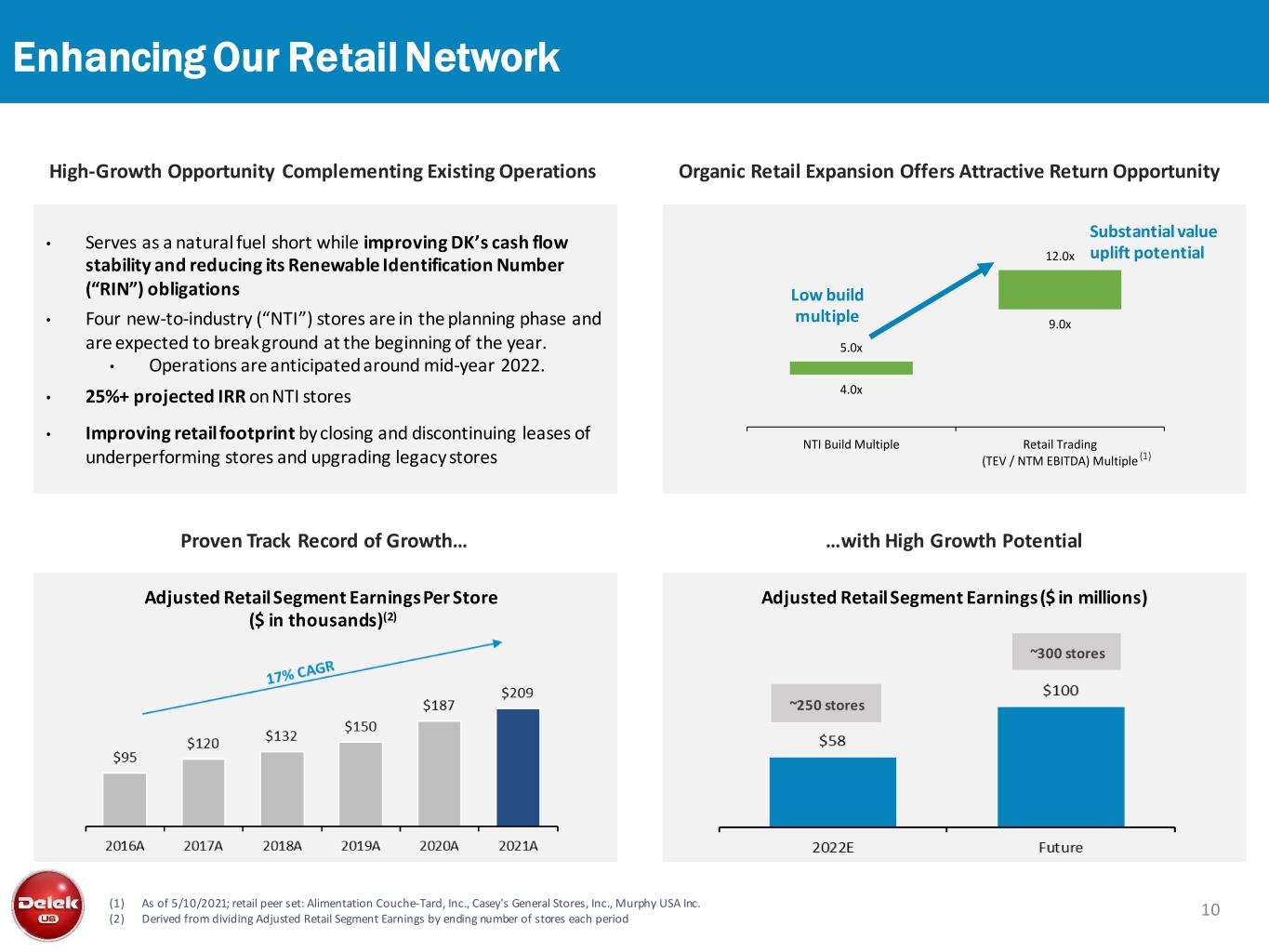9 Aligning Our Portfolio with the Most Attractive Opportunities Divestitures Over $800 million in proceeds since 2016 from well-timed divestitures to enhance our portfolio composition Dropdowns Asset dropdowns to DKL have created substantial value at both DK and DKL Joint Ventures Joint ventures have provided DK and DKL with low-cost opportunities to expand operations and increase cash flows Acquisitions Built a strong portfolio by strategically acquiring complementary assets 2019A Adj. Segment Earnings(1) 2022E Targeted Adj. Segment Earnings(1) (1) See definition in Non-GAAP Disclosures discussion on page 2 and reconciliation to GAAP measure on page 36 Refining Midstream & Retail Projected growth from midstream and retail (excludes upside from new stores) 61% 39% Focus on diversifying cash flow streams and reducing cash flow volatility Track record of actively managing our portfolio 75% 25%