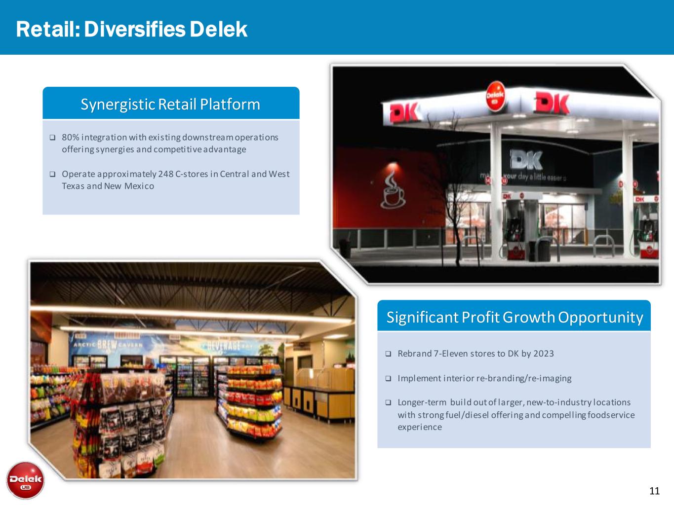 4.0x 9.0x 5.0x 12.0x NTI Build Multiple Retail Trading (TEV / NTM EBITDA) Multiple Substantial value uplift potential Low build multiple 10 Enhancing Our Retail Network • Serves as a natural fuel short while improving DK’s cash flow stability and reducing its Renewable Identification Number (“RIN”) obligations • Four new-to-industry (“NTI”) stores are in the planning phase and are expected to break ground at the beginning of the year. • Operations are anticipated around mid-year 2022. • 25%+ projected IRR on NTI stores • Improving retail footprint by closing and discontinuing leases of underperforming stores and upgrading legacy stores High-Growth Opportunity Complementing Existing Operations (1) As of 5/10/2021; retail peer set: Alimentation Couche-Tard, Inc., Casey's General Stores, Inc., Murphy USA Inc. (2) Derived from dividing Adjusted Retail Segment Earnings by ending number of stores each period (1) Organic Retail Expansion Offers Attractive Return Opportunity Proven Track Record of Growth… Adjusted Retail Segment Earnings Per Store ($ in thousands)(2) …with High Growth Potential Adjusted Retail Segment Earnings ($ in millions) ~250 stores ~300 stores