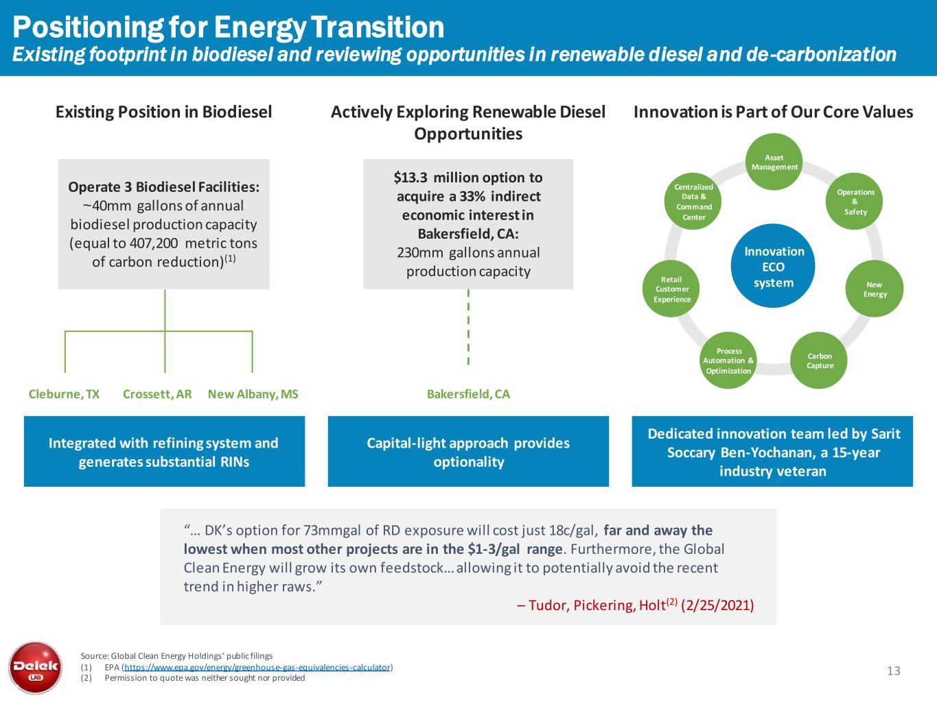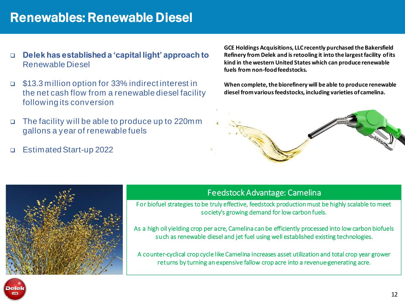 Renewables: Renewable Diesel 12 ❑ Delek has established a ‘capital light’ approach to Renewable Diesel ❑ $13.3 million option for 33% indirect interest in the net cash flow from a renewable diesel facility following its conversion ❑ The facility will be able to produce up to 220mm gallons a year of renewable fuels ❑ Estimated Start-up 2022 For biofuel strategies to be truly effective, feedstock production must be highly scalable to meet society's growing demand for low carbon fuels. As a high oil yielding crop per acre, Camelina can be efficiently processed into low carbon biofuels such as renewable diesel and jet fuel using well established existing technologies. A counter-cyclical crop cycle like Camelina increases asset utilization and total crop year grower returns by turning an expensive fallow crop acre into a revenue-generating acre. Feedstock Advantage: Camelina GCE Holdings Acquisitions, LLC recently purchased the Bakersfield Refinery from Delek and is retooling it into the largest facility of its kind in the western United States which can produce renewable fuels from non-food feedstocks. When complete, the biorefinery will be able to produce renewable diesel from various feedstocks, including varieties of camelina.