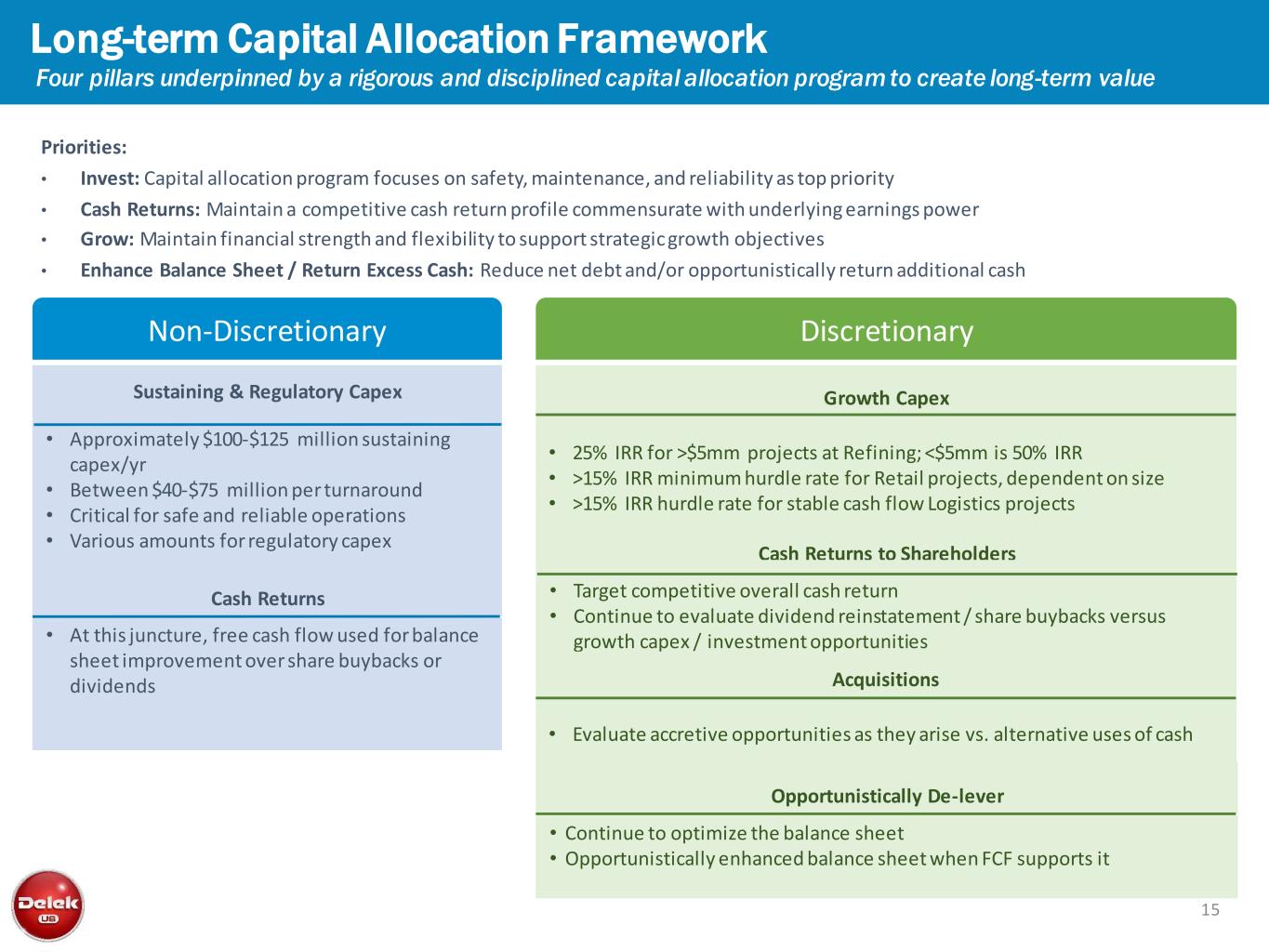 Long-term Capital Allocation Framework Four pillars underpinned by a rigorous and disciplined capital allocation program to create long-term value Priorities: • Invest: Capital allocation program focuses on safety, maintenance, and reliability as top priority • Cash Returns: Maintain a competitive cash return profile commensurate with underlying earnings power • Grow: Maintain financial strength and flexibility to support strategic growth objectives • Enhance Balance Sheet / Return Excess Cash: Reduce net debt and/or opportunistically return additional cash Sustaining Capex • Approximately $100-$125 million sustaining capex/yr • Between $40-$75 million per turnaround • Critical for safe and reliable operations • Various amounts for regulatory capex Sustaining & Regulatory Capex Non-Discretionary • At this juncture, free cash flow used for balance sheet improvement over share buybacks or dividends Cash Returns Discretionary Growth Capex • 25% IRR for >$5mm projects at Refining; <$5mm is 50% IRR • >15% IRR minimum hurdle rate for Retail projects, dependent on size • >15% IRR hurdle rate for stable cash flow Logistics projects Cash Returns to Shareholders • Target competitive overall cash return • Continue to evaluate dividend reinstatement / share buybacks versus growth capex / investment opportunities Acquisitions • Evaluate accretive opportunities as they arise vs. alternative uses of cash Opportunistically De-lever • Continue to optimize the balance sheet • Opportunistically enhanced balance sheet when FCF supports it 15