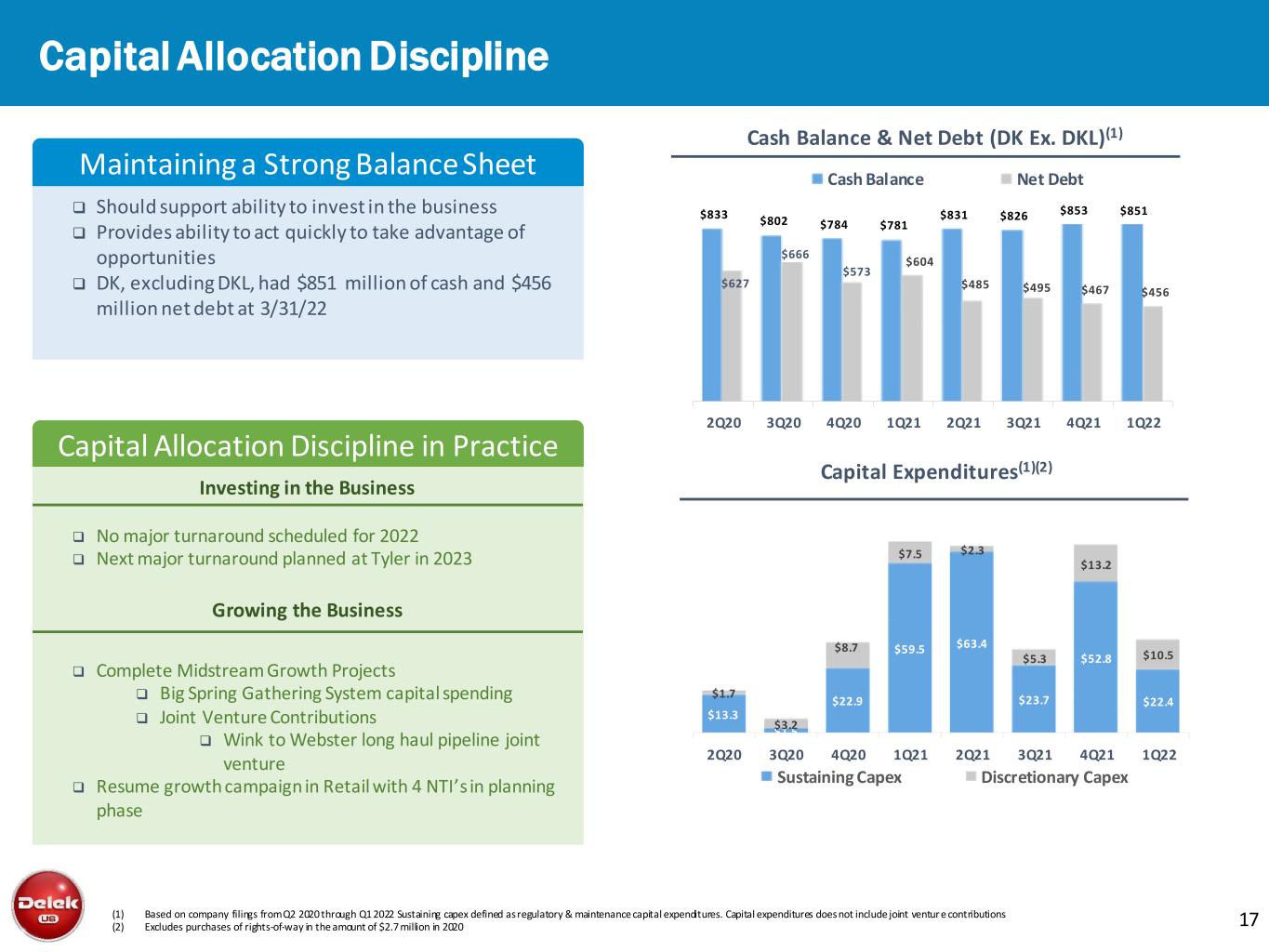 $13.3 $1.5 $22.9 $59.5 $63.4 $23.7 $52.8 $22.4 $1.7 $3.2 $8.7 $7.5 $2.3 $5.3 $13.2 $10.5 2Q20 3Q20 4Q20 1Q21 2Q21 3Q21 4Q21 1Q22 Sustaining Capex Discretionary Capex 17 Capital Allocation Discipline $833 $802 $784 $781 $831 $826 $853 $851 $627 $666 $573 $604 $485 $495 $467 $456 2Q20 3Q20 4Q20 1Q21 2Q21 3Q21 4Q21 1Q22 Cash Balance Net Debt Cash Balance & Net Debt (DK Ex. DKL)(1) Capital Expenditures(1)(2) (1) Based on company filings from Q2 2020 through Q1 2022 Sustaining capex defined as regulatory & maintenance capital expenditures. Capital expenditures does not include joint ventur e contributions (2) Excludes purchases of rights-of-way in the amount of $2.7 million in 2020 Maintaining a Strong Balance Sheet ❑ Should support ability to invest in the business ❑ Provides ability to act quickly to take advantage of opportunities ❑ DK, excluding DKL, had $851 million of cash and $456 million net debt at 3/31/22 Capital Allocation Discipline in Practice Investing in the Business ❑ No major turnaround scheduled for 2022 ❑ Next major turnaround planned at Tyler in 2023 Growing the Business ❑ Complete Midstream Growth Projects ❑ Big Spring Gathering System capital spending ❑ Joint Venture Contributions ❑ Wink to Webster long haul pipeline joint venture ❑ Resume growth campaign in Retail with 4 NTI’s in planning phase