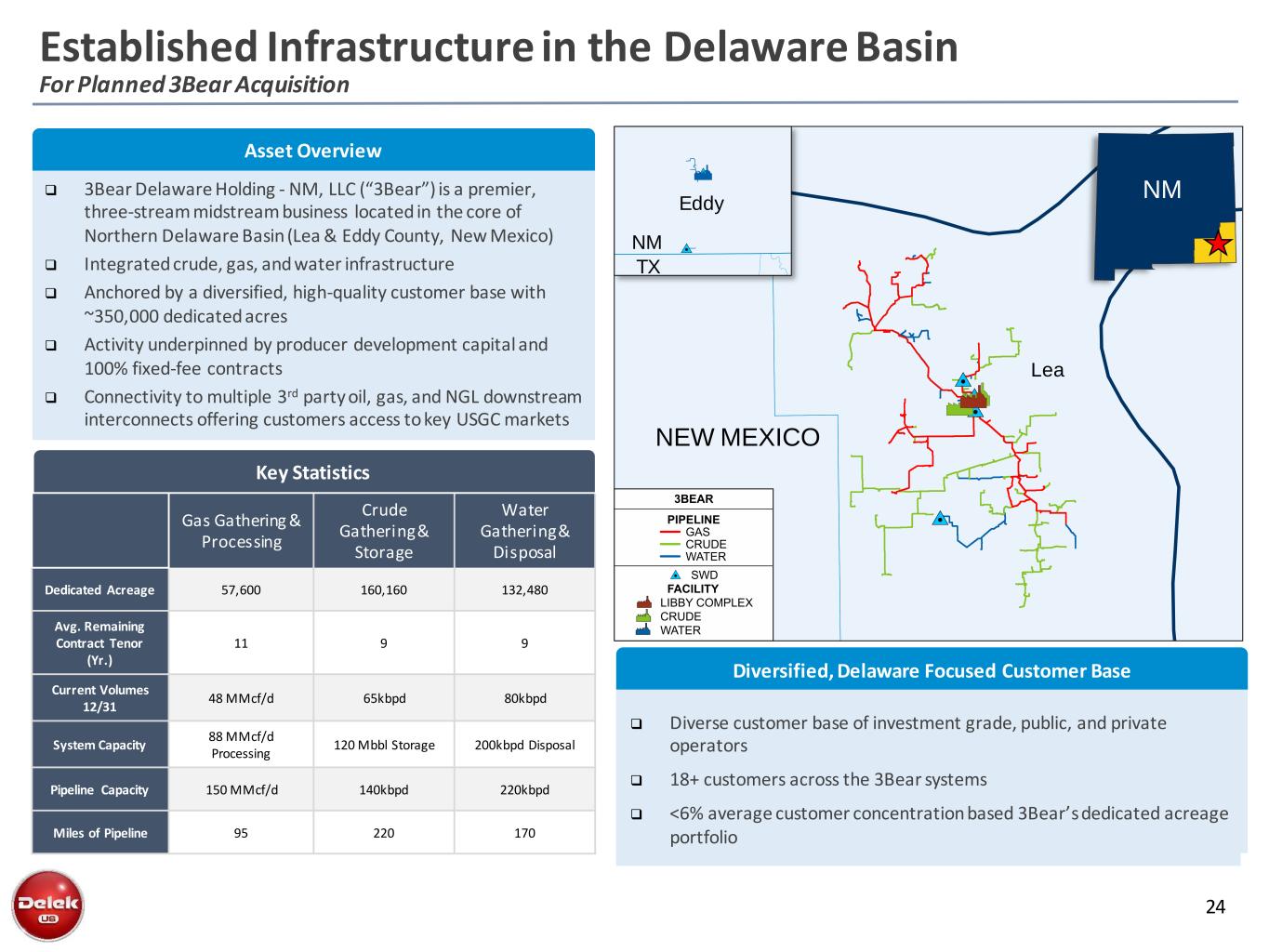 • Recently constructed asset in the most active area of the Delaware Basin (Lea and Eddy County, NM) • ~485 miles of in-ground pipeline currently • 88 MMcf/d of gas processing capacity; 140kbpd of crude gathering capacity supported by 120kbbls of storage; 200kbpd salt water disposal; offers producers one-stop-shop • Substantial upside optionality through expansion of existing facilities and infrastructure High Quality 3-Stream Revenue Investment Considerations for Planned 3Bear Acquisition Increased Exposure to Highly Economic Delaware Basin, Third-Party Revenue; Expands Geographic and Commodity Diversification • Entry into the Delaware Basin which supports Delek’s long-term growth and integration strategies • Footprint anchored by long-term, fixed fee contracts (avg. remaining contract tenor of ~10 yrs.(1)) supported by a diverse group of Permian focused producers with 13 active rigs on dedicated acreage (2) • >3,000 remaining drilling locations(3) on dedicated acres provides visibility for long-term cash flow Attractive Footprint in the Heart of the Delaware • Significantly increases third party revenue and diversifies customer mix • Expands Permian presence from the Midland Basin to the Delaware Basin • Broadens product mix with increased exposure to natural gas and water • Long-term fixed fee contracts mitigates commodity exposure Enhances Diversification and Stability • Immediately accretive to Distributable Cash Flow and Coverage Ratios supporting 5% annual distribution growth • Strong Free Cash Flow generation enables a deleveraging profile near-term • Capital needs increase FY 2022 guidance by ~$10mm to approximately $80 million Accretive Transaction • Significant carbon capture optionality reinforces Delek’s commitment to ESG initiatives • Water recycling operations reduce total freshwater consumption and use in the Permian • Multiple GHG reduction projects underway providing CO2 reduction in the near term • Additional options offer potential to improve clean energy initiatives ESG Initiatives (1) Weighted-average by acreage. (2) Per Enverus as of Q4 2021. (3) Per third-party consultants. 23