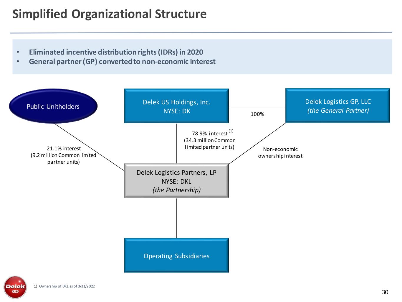 30 Simplified Organizational Structure 21.1% interest (9.2 million Common limited partner units) 100% Delek Logistics Partners, LP NYSE: DKL (the Partnership) Public Unitholders Operating Subsidiaries 78.9% interest (34.3 million Common l imited partner units) Delek Logistics GP, LLC (the General Partner) Delek US Holdings, Inc. NYSE: DK • Eliminated incentive distribution rights (IDRs) in 2020 • General partner (GP) converted to non-economic interest Non-economic ownership interest 1) Ownership of DKL as of 3/31/2022 (1)