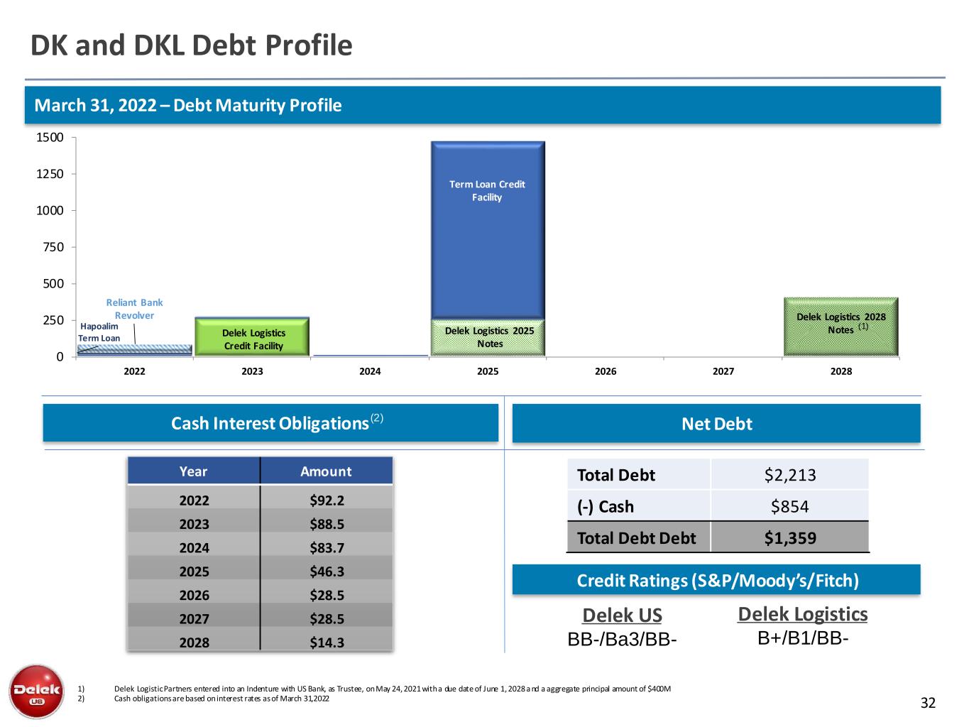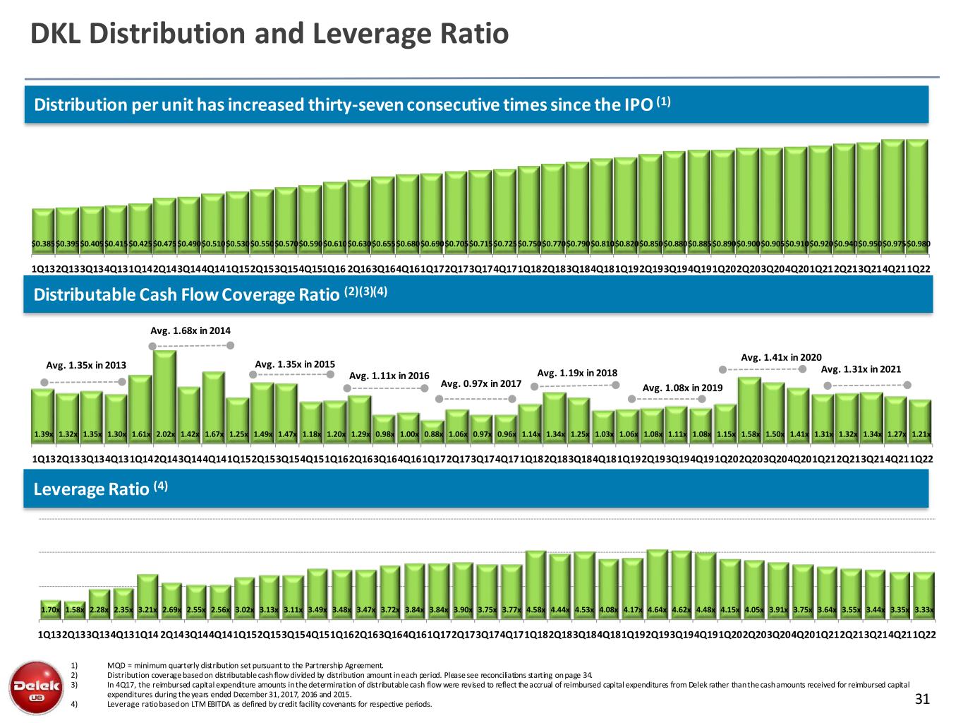 1.39x 1.32x 1.35x 1.30x 1.61x 2.02x 1.42x 1.67x 1.25x 1.49x 1.47x 1.18x 1.20x 1.29x 0.98x 1.00x 0.88x 1.06x 0.97x 0.96x 1.14x 1.34x 1.25x 1.03x 1.06x 1.08x 1.11x 1.08x 1.15x 1.58x 1.50x 1.41x 1.31x 1.32x 1.34x 1.27x 1.21x 1Q132Q133Q134Q131Q142Q143Q144Q141Q152Q153Q154Q151Q162Q163Q164Q161Q172Q173Q174Q171Q182Q183Q184Q181Q192Q193Q194Q191Q202Q203Q204Q201Q212Q213Q214Q211Q22 Avg. 1.08x in 2019 Avg. 1.41x in 2020 31 1) MQD = minimum quarterly distribution set pursuant to the Partnership Agreement. 2) Distribution coverage based on distributable cash flow divided by distribution amount in each period. Please see reconciliations starting on page 34. 3) In 4Q17, the reimbursed capital expenditure amounts in the determination of distributable cash flow were revised to reflect the accrual of reimbursed capital expenditures from Delek rather than the cash amounts received for reimbursed capital expenditures during the years ended December 31, 2017, 2016 and 2015. 4) Leverage ratio based on LTM EBITDA as defined by credit facility covenants for respective periods. Distribution per unit has increased thirty-seven consecutive times since the IPO (1) Distributable Cash Flow Coverage Ratio (2)(3)(4) Leverage Ratio (4) DKL Distribution and Leverage Ratio Avg. 1.35x in 2013 Avg. 1.68x in 2014 Avg. 1.35x in 2015 Avg. 1.11x in 2016 Avg. 0.97x in 2017 Avg. 1.19x in 2018 $0.385$0.395$0.405$0.415$0.425$0.475$0.490$0.510$0.530$0.550$0.570$0.590$0.610$0.630$0.655$0.680$0.690$0.705$0.715$0.725$0.750$0.770$0.790$0.810$0.820$0.850$0.880$0.885$0.890$0.900$0.905$0.910$0.920$0.940$0.950$0.975$0.980 1Q132Q133Q134Q131Q142Q143Q144Q141Q152Q153Q154Q151Q16 2Q163Q164Q161Q172Q173Q174Q171Q182Q183Q184Q181Q192Q193Q194Q191Q202Q203Q204Q201Q212Q213Q214Q211Q22 1.70x 1.58x 2.28x 2.35x 3.21x 2.69x 2.55x 2.56x 3.02x 3.13x 3.11x 3.49x 3.48x 3.47x 3.72x 3.84x 3.84x 3.90x 3.75x 3.77x 4.58x 4.44x 4.53x 4.08x 4.17x 4.64x 4.62x 4.48x 4.15x 4.05x 3.91x 3.75x 3.64x 3.55x 3.44x 3.35x 3.33x 1Q132Q133Q134Q131Q14 2Q143Q144Q141Q152Q153Q154Q151Q162Q163Q164Q161Q172Q173Q174Q171Q182Q183Q184Q181Q192Q193Q194Q191Q202Q203Q204Q201Q212Q213Q214Q211Q22 Avg. 1.31x in 2021
