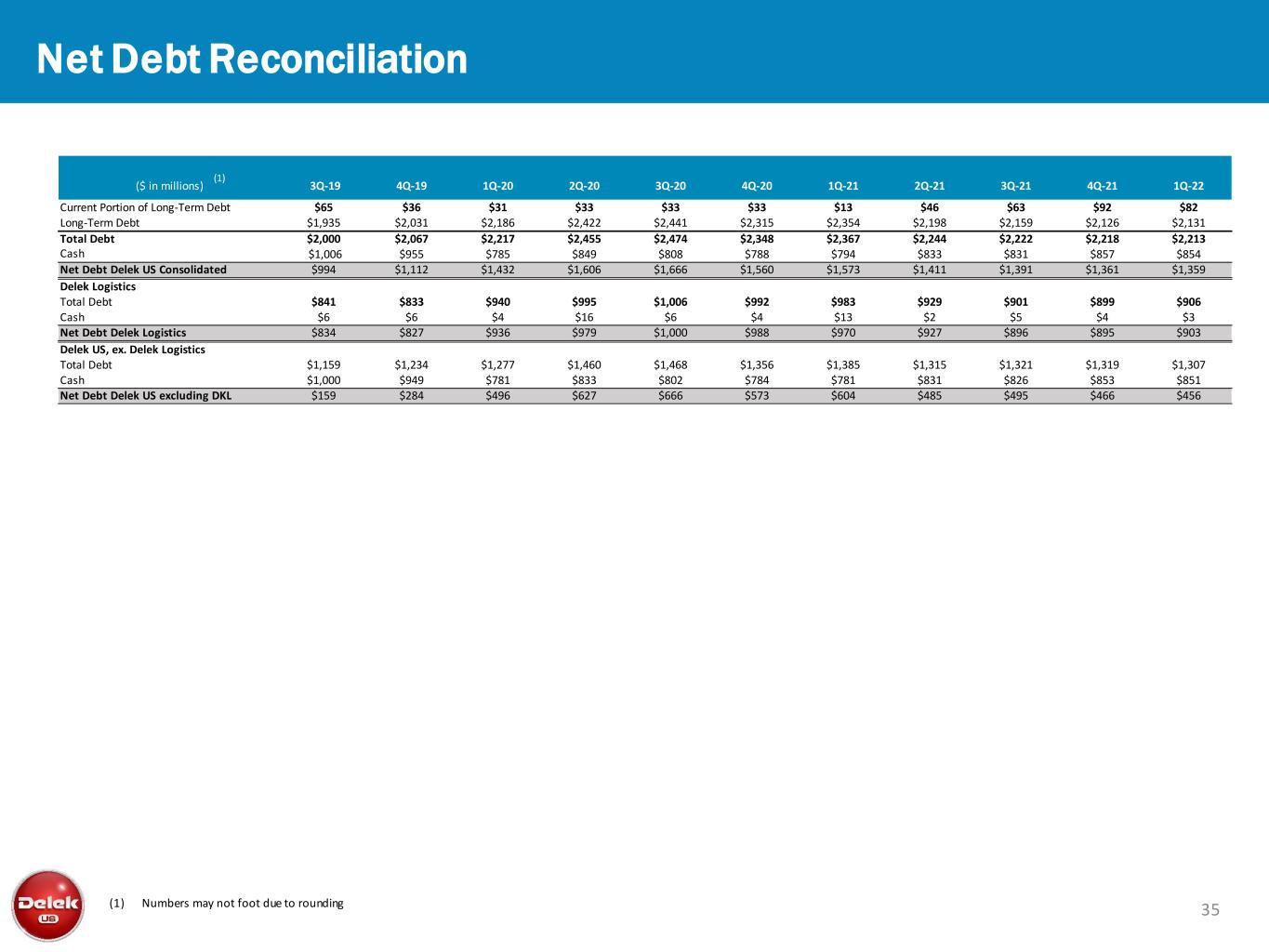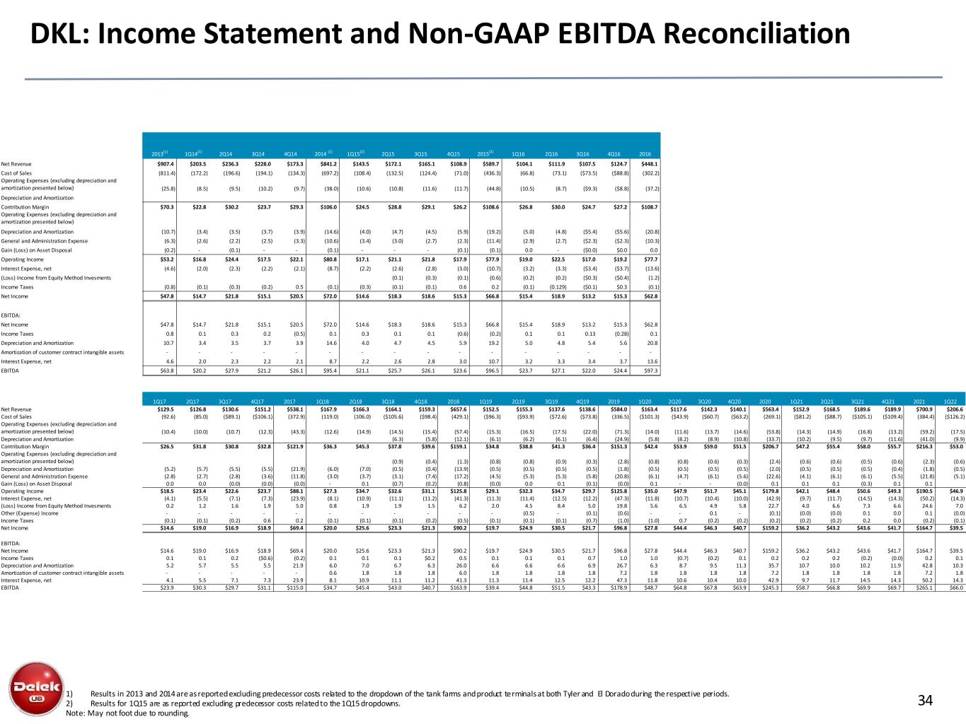 34 1) Results in 2013 and 2014 are as reported excluding predecessor costs related to the dropdown of the tank farms and product terminals at both Tyler and El Dorado during the respective periods. 2) Results for 1Q15 are as reported excluding predecessor costs related to the 1Q15 dropdowns. Note: May not foot due to rounding. DKL: Income Statement and Non-GAAP EBITDA Reconciliation 2013 (1) 1Q14 (1) 2Q14 3Q14 4Q14 2014 (1) 1Q15 (2) 2Q15 3Q15 4Q15 2015 (2) 1Q16 2Q16 3Q16 4Q16 2016 Net Revenue $907.4 $203.5 $236.3 $228.0 $173.3 $841.2 $143.5 $172.1 $165.1 $108.9 $589.7 $104.1 $111.9 $107.5 $124.7 $448.1 Cost of Sales (811.4) (172.2) (196.6) (194.1) (134.3) (697.2) (108.4) (132.5) (124.4) (71.0) (436.3) (66.8) (73.1) ($73.5) ($88.8) (302.2) Operating Expenses (excluding depreciation and amortization presented below) (25.8) (8.5) (9.5) (10.2) (9.7) (38.0) (10.6) (10.8) (11.6) (11.7) (44.8) (10.5) (8.7) ($9.3) ($8.8) (37.2) Depreciation and Amortization Contribution Margin $70.3 $22.8 $30.2 $23.7 $29.3 $106.0 $24.5 $28.8 $29.1 $26.2 $108.6 $26.8 $30.0 $24.7 $27.2 $108.7 Operating Expenses (excluding depreciation and amortization presented below) Depreciation and Amortization (10.7) (3.4) (3.5) (3.7) (3.9) (14.6) (4.0) (4.7) (4.5) (5.9) (19.2) (5.0) (4.8) ($5.4) ($5.6) (20.8) General and Administration Expense (6.3) (2.6) (2.2) (2.5) (3.3) (10.6) (3.4) (3.0) (2.7) (2.3) (11.4) (2.9) (2.7) ($2.3) ($2.3) (10.3) Gain (Loss) on Asset Disposal (0.2) - (0.1) - - (0.1) - - - (0.1) (0.1) 0.0 - ($0.0) $0.0 0.0 Operating Income $53.2 $16.8 $24.4 $17.5 $22.1 $80.8 $17.1 $21.1 $21.8 $17.9 $77.9 $19.0 $22.5 $17.0 $19.2 $77.7 Interest Expense, net (4.6) (2.0) (2.3) (2.2) (2.1) (8.7) (2.2) (2.6) (2.8) (3.0) (10.7) (3.2) (3.3) ($3.4) ($3.7) (13.6) (Loss) Income from Equity Method Invesments (0.1) (0.3) (0.1) (0.6) (0.2) (0.2) ($0.3) ($0.4) (1.2) Income Taxes (0.8) (0.1) (0.3) (0.2) 0.5 (0.1) (0.3) (0.1) (0.1) 0.6 0.2 (0.1) (0.129) ($0.1) $0.3 (0.1) Net Income $47.8 $14.7 $21.8 $15.1 $20.5 $72.0 $14.6 $18.3 $18.6 $15.3 $66.8 $15.4 $18.9 $13.2 $15.3 $62.8 EBITDA: Net Income $47.8 $14.7 $21.8 $15.1 $20.5 $72.0 $14.6 $18.3 $18.6 $15.3 $66.8 $15.4 $18.9 $13.2 $15.3 $62.8 Income Taxes 0.8 0.1 0.3 0.2 (0.5) 0.1 0.3 0.1 0.1 (0.6) (0.2) 0.1 0.1 0.13 (0.28) 0.1 Depreciation and Amortization 10.7 3.4 3.5 3.7 3.9 14.6 4.0 4.7 4.5 5.9 19.2 5.0 4.8 5.4 5.6 20.8 Amortization of customer contract intangible assets - - - - - - - - - - - - - - - - Interest Expense, net 4.6 2.0 2.3 2.2 2.1 8.7 2.2 2.6 2.8 3.0 10.7 3.2 3.3 3.4 3.7 13.6 EBITDA $63.8 $20.2 $27.9 $21.2 $26.1 $95.4 $21.1 $25.7 $26.1 $23.6 $96.5 $23.7 $27.1 $22.0 $24.4 $97.3 1Q17 2Q17 3Q17 4Q17 2017 1Q18 2Q18 3Q18 4Q18 2018 1Q19 2Q19 3Q19 4Q19 2019 1Q20 2Q20 3Q20 4Q20 2020 1Q21 2Q21 3Q21 4Q21 2021 1Q22 Net Revenue $129.5 $126.8 $130.6 $151.2 $538.1 $167.9 $166.3 $164.1 $159.3 $657.6 $152.5 $155.3 $137.6 $138.6 $584.0 $163.4 $117.6 $142.3 $140.1 $563.4 $152.9 $168.5 $189.6 $189.9 $700.9 $206.6 Cost of Sales (92.6) (85.0) ($89.1) ($106.1) (372.9) (119.0) (106.0) ($105.6) ($98.4) (429.1) ($96.3) ($93.9) ($72.6) ($73.8) (336.5) ($101.3) ($43.9) ($60.7) ($63.2) (269.1) ($81.2) ($88.7) ($105.1) ($109.4) (384.4) ($126.2) Operating Expenses (excluding depreciation and amortization presented below) (10.4) (10.0) (10.7) (12.3) (43.3) (12.6) (14.9) (14.5) (15.4) (57.4) (15.3) (16.5) (17.5) (22.0) (71.3) (14.0) (11.6) (13.7) (14.6) (53.8) (14.3) (14.9) (16.8) (13.2) (59.2) (17.5) Depreciation and Amortization (6.3) (5.8) (12.1) (6.1) (6.2) (6.1) (6.4) (24.9) (5.8) (8.2) (8.9) (10.8) (33.7) (10.2) (9.5) (9.7) (11.6) (41.0) (9.9) Contribution Margin $26.5 $31.8 $30.8 $32.8 $121.9 $36.3 $45.3 $37.8 $39.6 $159.1 $34.8 $38.8 $41.3 $36.4 $151.3 $42.4 $53.9 $59.0 $51.5 $206.7 $47.2 $55.4 $58.0 $55.7 $216.3 $53.0 Operating Expenses (excluding depreciation and amortization presented below) (0.9) (0.4) (1.3) (0.8) (0.8) (0.9) (0.3) (2.8) (0.8) (0.8) (0.6) (0.3) (2.4) (0.6) (0.6) (0.5) (0.6) (2.3) (0.6) Depreciation and Amortization (5.2) (5.7) (5.5) (5.5) (21.9) (6.0) (7.0) (0.5) (0.4) (13.9) (0.5) (0.5) (0.5) (0.5) (1.8) (0.5) (0.5) (0.5) (0.5) (2.0) (0.5) (0.5) (0.5) (0.4) (1.8) (0.5) General and Administration Expense (2.8) (2.7) (2.8) (3.6) (11.8) (3.0) (3.7) (3.1) (7.4) (17.2) (4.5) (5.3) (5.3) (5.8) (20.8) (6.1) (4.7) (6.1) (5.6) (22.6) (4.1) (6.1) (6.1) (5.5) (21.8) (5.1) Gain (Loss) on Asset Disposal 0.0 0.0 (0.0) (0.0) (0.0) - 0.1 (0.7) (0.2) (0.8) (0.0) 0.0 0.1 (0.1) (0.0) 0.1 - - (0.0) 0.1 0.1 0.1 (0.3) 0.1 0.1 Operating Income $18.5 $23.4 $22.6 $23.7 $88.1 $27.3 $34.7 $32.6 $31.1 $125.8 $29.1 $32.3 $34.7 $29.7 $125.8 $35.0 $47.9 $51.7 $45.1 $179.8 $42.1 $48.4 $50.6 $49.3 $190.5 $46.9 Interest Expense, net (4.1) (5.5) (7.1) (7.3) (23.9) (8.1) (10.9) (11.1) (11.2) (41.3) (11.3) (11.4) (12.5) (12.2) (47.3) (11.8) (10.7) (10.4) (10.0) (42.9) (9.7) (11.7) (14.5) (14.3) (50.2) (14.3) (Loss) Income from Equity Method Invesments 0.2 1.2 1.6 1.9 5.0 0.8 1.9 1.9 1.5 6.2 2.0 4.5 8.4 5.0 19.8 5.6 6.5 4.9 5.8 22.7 4.0 6.6 7.3 6.6 24.6 7.0 Other (Expense) Income - - - - - - - - - - - (0.5) - (0.1) (0.6) - - 0.1 - (0.1) (0.0) (0.0) 0.1 0.0 0.1 (0.0) Income Taxes (0.1) (0.1) (0.2) 0.6 0.2 (0.1) (0.1) (0.1) (0.2) (0.5) (0.1) (0.1) (0.1) (0.7) (1.0) (1.0) 0.7 (0.2) (0.2) (0.2) (0.2) (0.2) 0.2 0.0 (0.2) (0.1) Net Income $14.6 $19.0 $16.9 $18.9 $69.4 $20.0 $25.6 $23.3 $21.3 $90.2 $19.7 $24.9 $30.5 $21.7 $96.8 $27.8 $44.4 $46.3 $40.7 $159.2 $36.2 $43.2 $43.6 $41.7 $164.7 $39.5 EBITDA: Net Income $14.6 $19.0 $16.9 $18.9 $69.4 $20.0 $25.6 $23.3 $21.3 $90.2 $19.7 $24.9 $30.5 $21.7 $96.8 $27.8 $44.4 $46.3 $40.7 $159.2 $36.2 $43.2 $43.6 $41.7 $164.7 $39.5 Income Taxes 0.1 0.1 0.2 ($0.6) (0.2) 0.1 0.1 0.1 $0.2 0.5 0.1 0.1 0.1 0.7 1.0 1.0 (0.7) (0.2) 0.1 0.2 0.2 0.2 (0.2) (0.0) 0.2 0.1 Depreciation and Amortization 5.2 5.7 5.5 5.5 21.9 6.0 7.0 6.7 6.3 26.0 6.6 6.6 6.6 6.9 26.7 6.3 8.7 9.5 11.3 35.7 10.7 10.0 10.2 11.9 42.8 10.3 Amortization of customer contract intangible assets - - - - - 0.6 1.8 1.8 1.