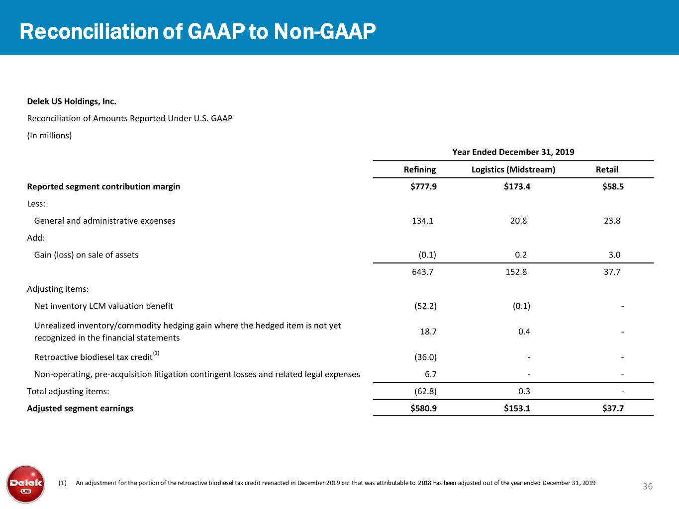 36 Reconciliation of GAAP to Non-GAAP Delek US Holdings, Inc. Reconciliation of Amounts Reported Under U.S. GAAP (In millions) Refining Logistics (Midstream) Retail Reported segment contribution margin $777.9 $173.4 $58.5 Less: General and administrative expenses 134.1 20.8 23.8 Add: Gain (loss) on sale of assets (0.1) 0.2 3.0 643.7 152.8 37.7 Adjusting items: Net inventory LCM valuation benefit (52.2) (0.1) - Unrealized inventory/commodity hedging gain where the hedged item is not yet recognized in the financial statements 18.7 0.4 - Retroactive biodiesel tax credit (36.0) - - Non-operating, pre-acquisition litigation contingent losses and related legal expenses 6.7 - - Total adjusting items: (62.8) 0.3 - Adjusted segment earnings $580.9 $153.1 $37.7 Year Ended December 31, 2019 (1) An adjustment for the portion of the retroactive biodiesel tax credit reenacted in December 2019 but that was attributable to 2018 has been adjusted out of the year ended December 31, 2019 (1)