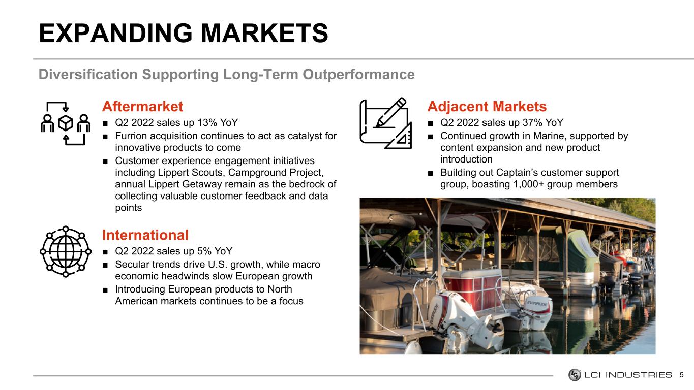 International ■ Q2 2022 sales up 5% YoY ■ Secular trends drive U.S. growth, while macro economic headwinds slow European growth ■ Introducing European products to North American markets continues to be a focus Aftermarket ■ Q2 2022 sales up 13% YoY ■ Furrion acquisition continues to act as catalyst for innovative products to come ■ Customer experience engagement initiatives including Lippert Scouts, Campground Project, annual Lippert Getaway remain as the bedrock of collecting valuable customer feedback and data points EXPANDING MARKETS Diversification Supporting Long-Term Outperformance Adjacent Markets ■ Q2 2022 sales up 37% YoY ■ Continued growth in Marine, supported by content expansion and new product introduction ■ Building out Captain’s customer support group, boasting 1,000+ group members 5