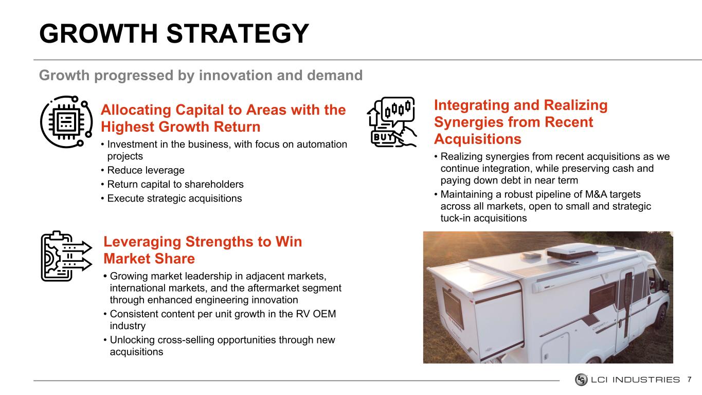 INNOVATION AS A CULTURE Innovation Focus Supporting Market Share and Content Expansion Continuously developing new product innovations to meet increasing demand for technologically-advanced products 6 Independent Suspension Gate Defender Jack ABS (Anti-Lock Brake) System OneControl On-The-Go Ladder Temp & Propane Sensors Furrion Power Cord Set