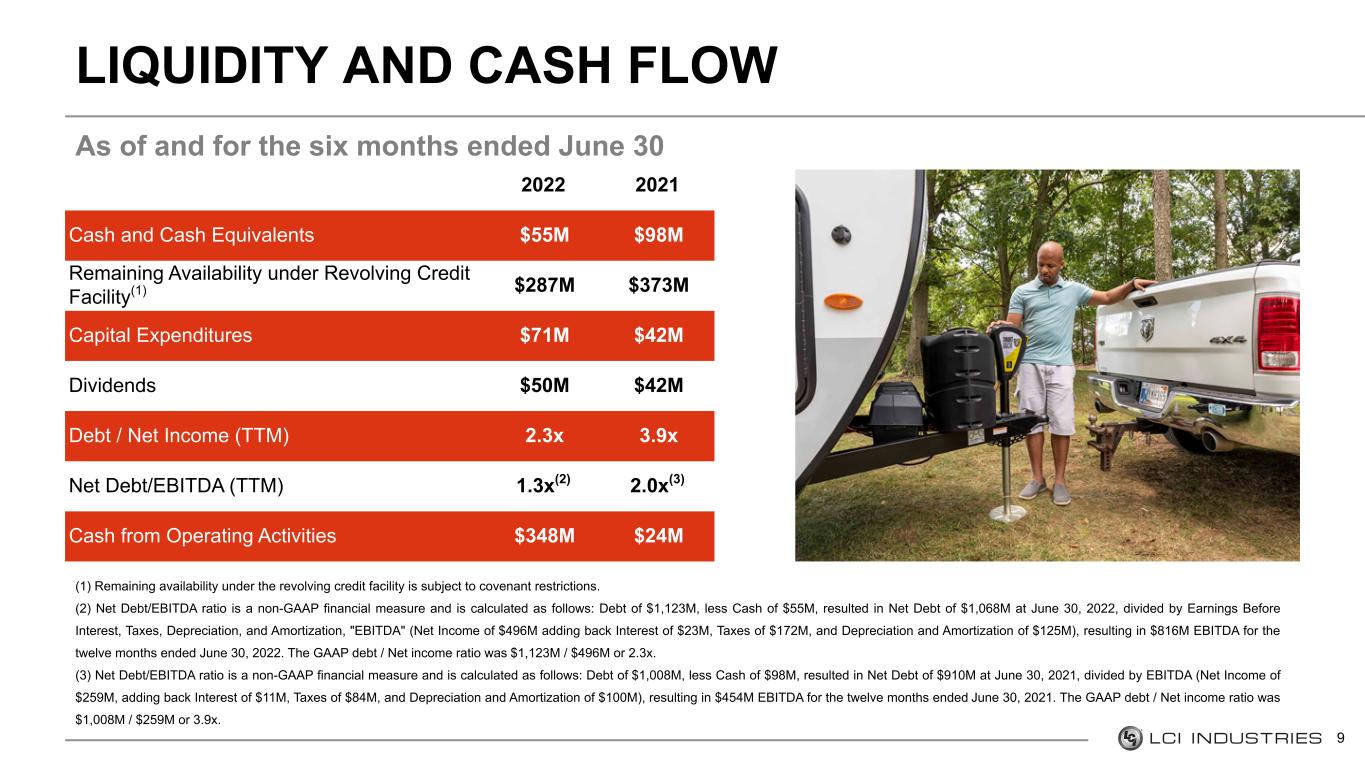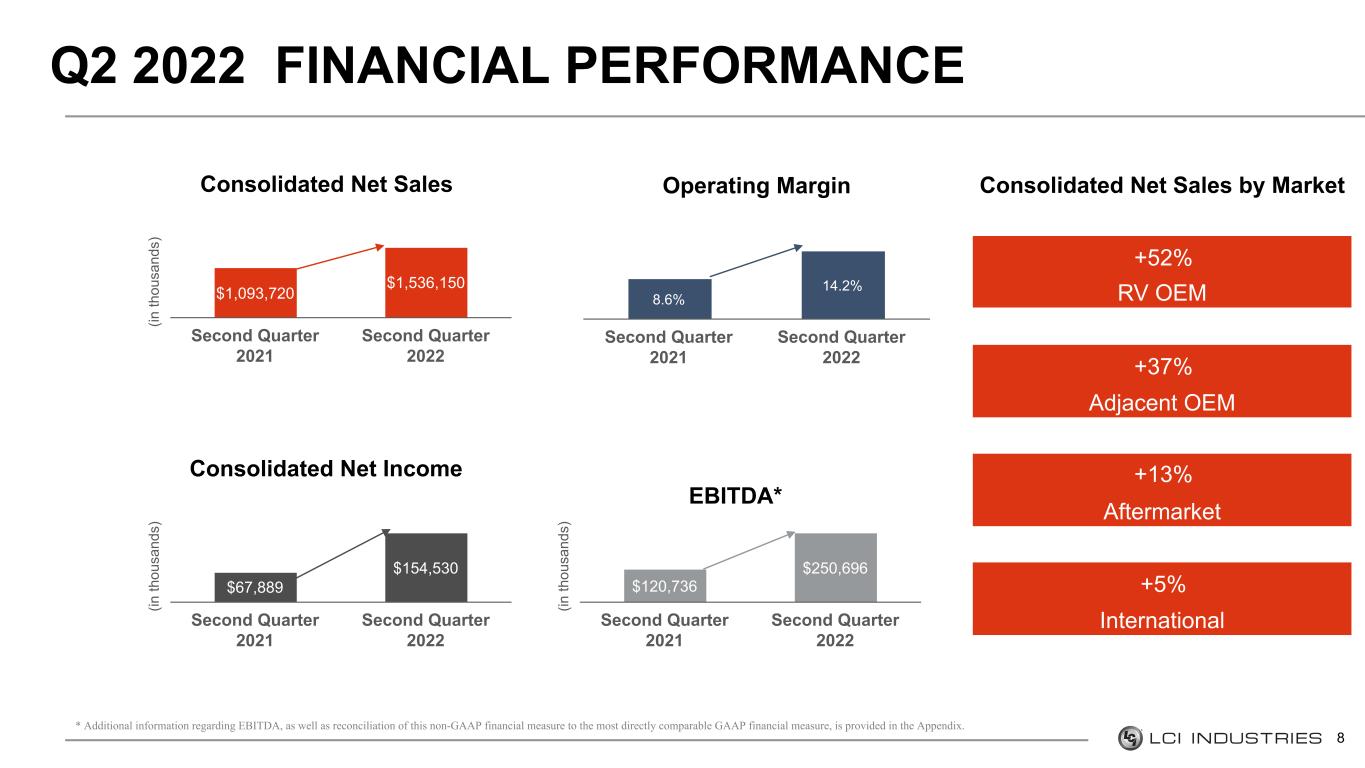 Operating Margin 8.6% 14.2% Second Quarter 2021 Second Quarter 2022 (in th ou sa nd s) Consolidated Net Income $67,889 $154,530 Second Quarter 2021 Second Quarter 2022 (in th ou sa nd s) EBITDA* $120,736 $250,696 Second Quarter 2021 Second Quarter 2022 Q2 2022 FINANCIAL PERFORMANCE * Additional information regarding EBITDA, as well as reconciliation of this non-GAAP financial measure to the most directly comparable GAAP financial measure, is provided in the Appendix. (in th ou sa nd s) Consolidated Net Sales $1,093,720 $1,536,150 Second Quarter 2021 Second Quarter 2022 Consolidated Net Sales by Market +52% RV OEM +37% Adjacent OEM +13% Aftermarket +5% International 8