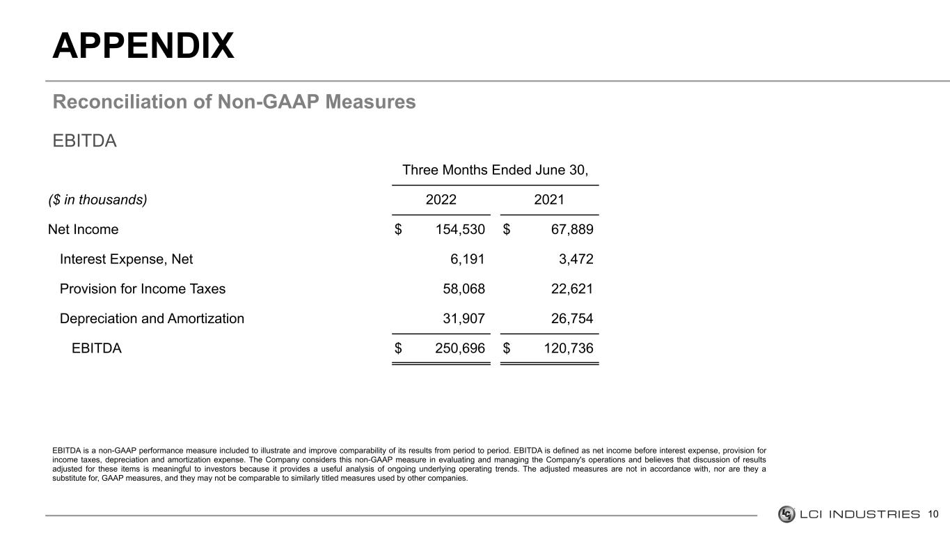 EBITDA Reconciliation of Non-GAAP Measures APPENDIX EBITDA is a non-GAAP performance measure included to illustrate and improve comparability of its results from period to period. EBITDA is defined as net income before interest expense, provision for income taxes, depreciation and amortization expense. The Company considers this non-GAAP measure in evaluating and managing the Company's operations and believes that discussion of results adjusted for these items is meaningful to investors because it provides a useful analysis of ongoing underlying operating trends. The adjusted measures are not in accordance with, nor are they a substitute for, GAAP measures, and they may not be comparable to similarly titled measures used by other companies. Three Months Ended June 30, ($ in thousands) 2022 2021 Net Income $ 154,530 $ 67,889 Interest Expense, Net 6,191 3,472 Provision for Income Taxes 58,068 22,621 Depreciation and Amortization 31,907 26,754 EBITDA $ 250,696 $ 120,736 10