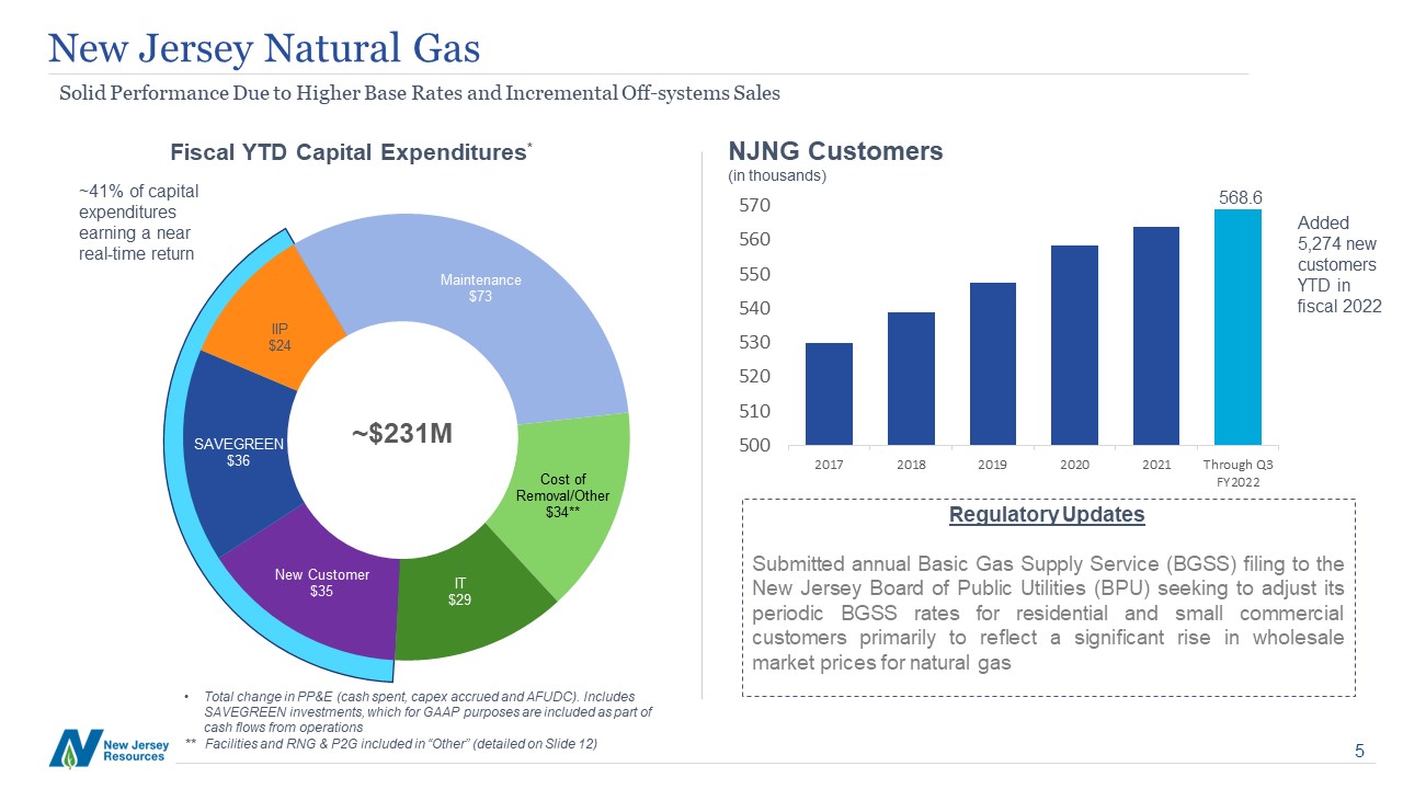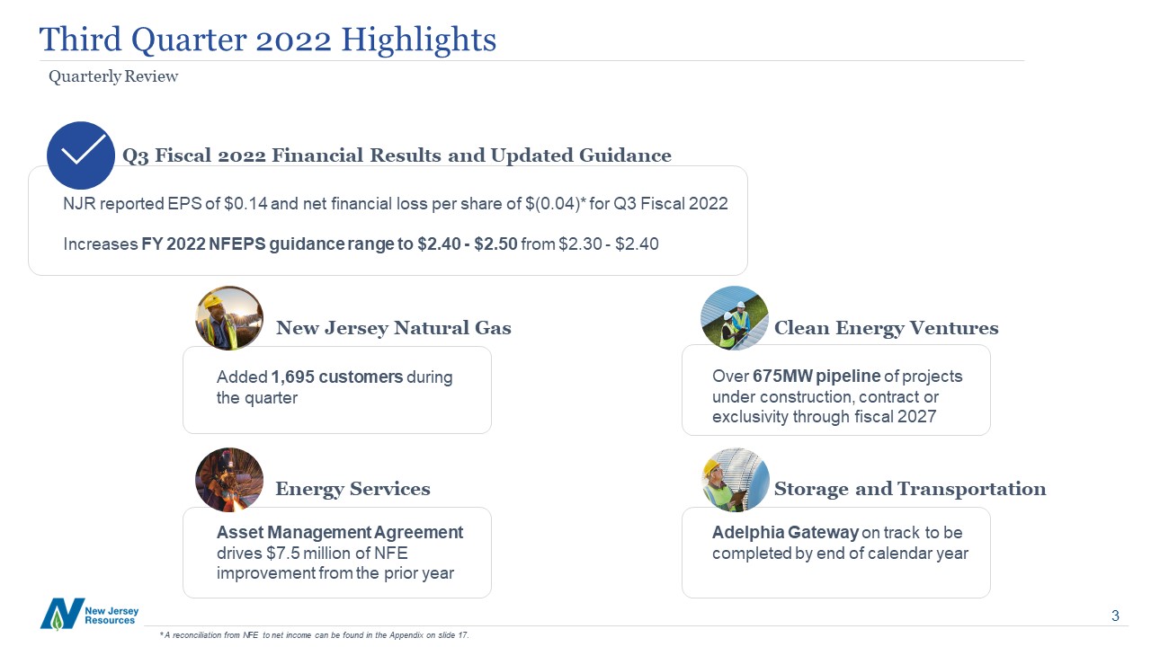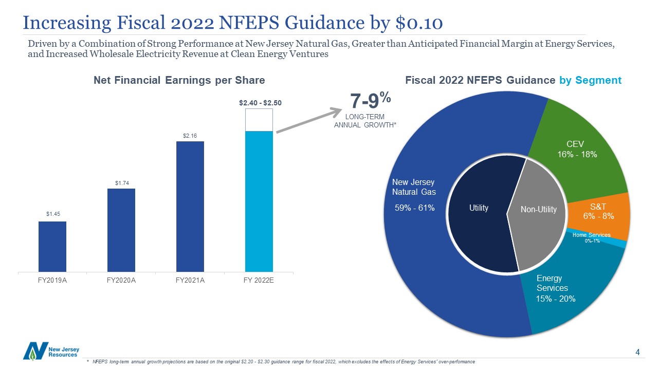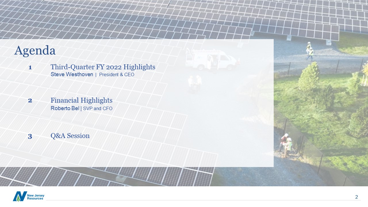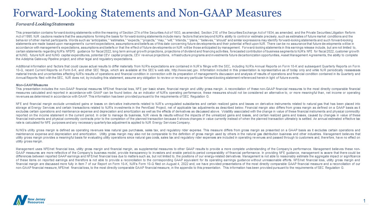 Forward-Looking Statements and Non-GAAP Measures   1  Forward-Looking Statements  This presentation contains forward-looking statements within the meaning of Section 27A of the Securities Act of 1933, as amended, Section 21E of the Securities Exchange Act of 1934, as amended, and the Private Securities Litigation Reform Act of 1995. NJR cautions readers that the assumptions forming the basis for forward-looking statements include many factors that are beyond NJR’s ability to control or estimate precisely, such as estimates of future market conditions and the behavior of other market participants. Words such as “anticipates,” “estimates,” “expects,” “projects,” “may,” “will,” “intends,” “plans,” “believes,” “should” and similar expressions may identify forward-looking statements and such forward-looking statements are made based upon management’s current expectations, assumptions and beliefs as of this date concerning future developments and their potential effect upon NJR. There can be no assurance that future developments will be in accordance with management’s expectations, assumptions and beliefs or that the effect of future developments on NJR will be those anticipated by management. Forward-looking statements in this earnings release include, but are not limited to, certain statements regarding NJR’s NFEPS guidance for fiscal 2022, long term annual growth projections, projections of dividend and financing activities, forecasted contribution of business segments to NJR’s NFE for fiscal 2022, customer growth at NJNG, future NJR and NJNG capital expenditures, potential CEV capital projects, CEV revenue projections, infrastructure programs and investments future decarbonization opportunities, Asset Management Agreements, the ability to complete the Adelphia Gateway Pipeline project, and other legal and regulatory expectations.  Additional information and factors that could cause actual results to differ materially from NJR’s expectations are contained in NJR’s filings with the SEC, including NJR’s Annual Reports on Form 10-K and subsequent Quarterly Reports on Form 10-Q, recent Current Reports on Form 8-K, and other SEC filings, which are available at the SEC’s web site, http://www.sec.gov. Information included in this presentation is representative as of today only and while NJR periodically reassesses material trends and uncertainties affecting NJR's results of operations and financial condition in connection with its preparation of management's discussion and analysis of results of operations and financial condition contained in its Quarterly and Annual Reports filed with the SEC, NJR does not, by including this statement, assume any obligation to review or revise any particular forward-looking statement referenced herein in light of future events.  Non-GAAP Measures  This presentation includes the non-GAAP financial measures NFE/net financial loss, NFE per basic share, financial margin and utility gross margin. A reconciliation of these non-GAAP financial measures to the most directly comparable financial measures calculated and reported in accordance with GAAP can be found below. As an indicator of NJR’s operating performance, these measures should not be considered an alternative to, or more meaningful than, net income or operating revenues as determined in accordance with GAAP. This information has been provided pursuant to the requirements of SEC Regulation G.  NFE and financial margin exclude unrealized gains or losses on derivative instruments related to NJR’s unregulated subsidiaries and certain realized gains and losses on derivative instruments related to natural gas that has been placed into storage at Energy Services and certain transactions related to NJR's investments in the PennEast Project, net of applicable tax adjustments as described below. Financial margin also differs from gross margin as defined on a GAAP basis as it excludes certain operations and maintenance expense and depreciation and amortization as well as the effects of derivatives as discussed above. Volatility associated with the change in value of these financial instruments and physical commodity reported on the income statement in the current period. In order to manage its business, NJR views its results without the impacts of the unrealized gains and losses, and certain realized gains and losses, caused by changes in value of these financial instruments and physical commodity contracts prior to the completion of the planned transaction because it shows changes in value currently instead of when the planned transaction ultimately is settled. An annual estimated effective tax rate is calculated for NFE purposes and any necessary quarterly tax adjustment is applied to NJR Energy Services Company.  NJNG’s utility gross margin is defined as operating revenues less natural gas purchases, sales tax, and regulatory rider expense. This measure differs from gross margin as presented on a GAAP basis as it excludes certain operations and maintenance expense and depreciation and amortization. Utility gross margin may also not be comparable to the definition of gross margin used by others in the natural gas distribution business and other industries. Management believes that utility gross margin provides a meaningful basis for evaluating utility operations since natural gas costs, sales tax and regulatory rider expenses are included in operating revenues and passed through to customers and, therefore, have no effect on utility gross margin.  Management uses NFE/net financial loss, utility gross margin and financial margin, as supplemental measures to other GAAP results to provide a more complete understanding of the Company’s performance. Management believes these non- GAAP measures are more reflective of the Company’s business model, provide transparency to investors and enable period-to-period comparability of financial perfor