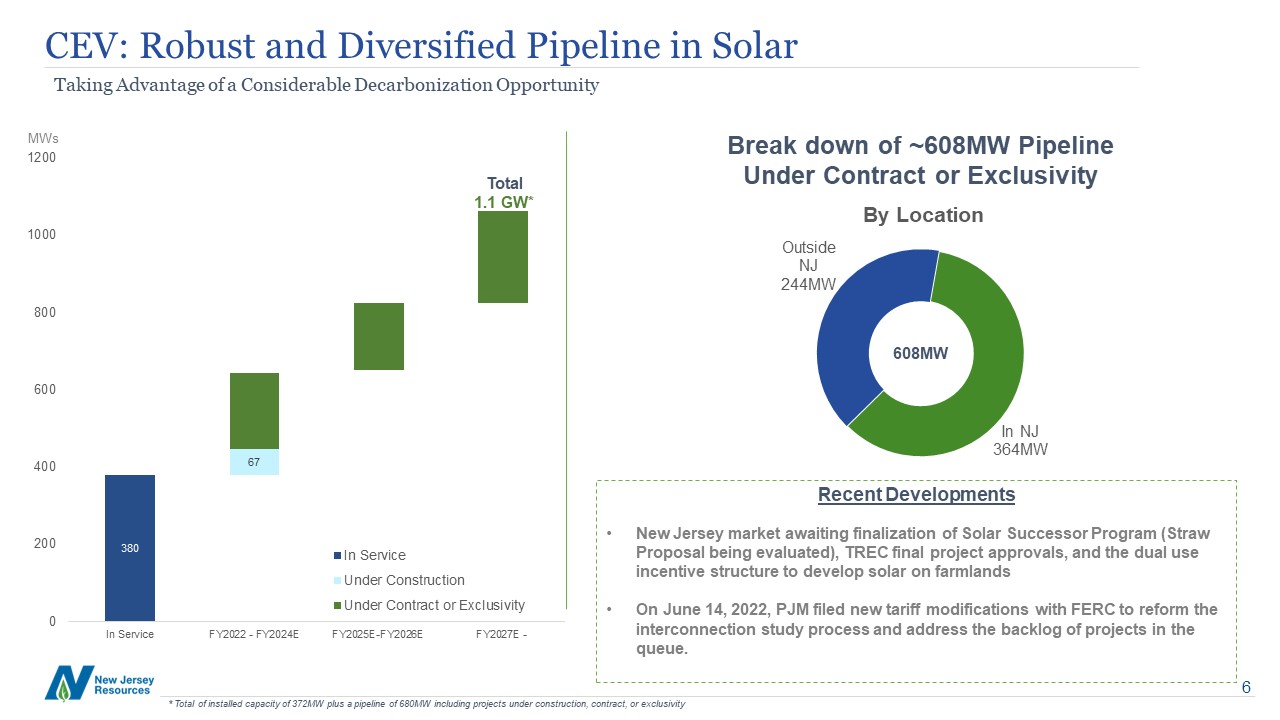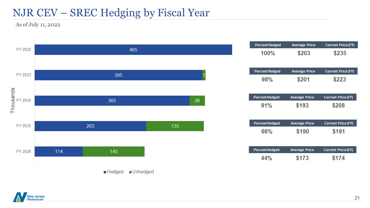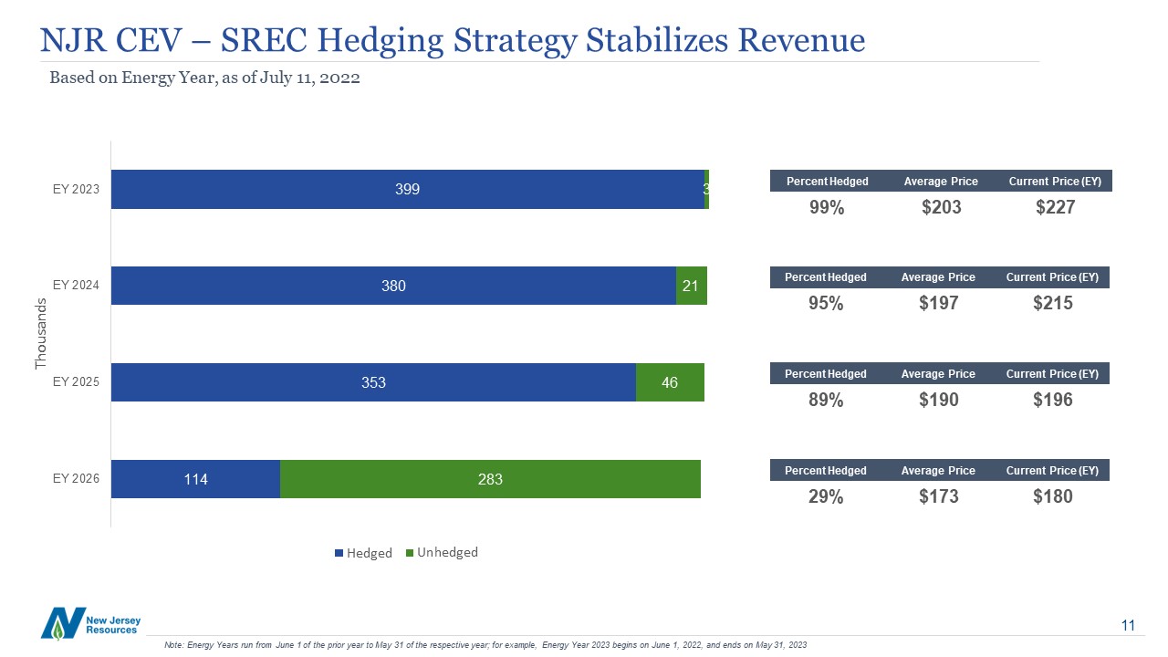 11  114  380  399  283  353 46  21  3  EY 2026  EY 2025  EY 2024  EY 2023  Thousands  Hedged  Unhedged  NJR CEV – SREC Hedging Strategy Stabilizes Revenue  Based on Energy Year, as of July 11, 2022  Percent Hedged  Average Price  Current Price (EY)  99%  $203  $227  Percent Hedged  Average Price  Current Price (EY)  95%  $197  $215  Percent Hedged  Average Price  Current Price (EY)  89%  $190  $196  Percent Hedged  Average Price  Current Price (EY)  29%  $173  $180  Note: Energy Years run from June 1 of the prior year to May 31 of the respective year; for example, Energy Year 2023 begins on June 1, 2022, and ends on May 31, 2023