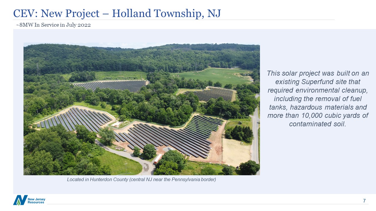CEV: New Project – Holland Township, NJ  This solar project was built on an existing Superfund site that required environmental cleanup, including the removal of fuel tanks, hazardous materials and more than 10,000 cubic yards of contaminated soil.  7  ~8MW In Service in July 2022  Located in Hunterdon County (central NJ near the Pennsylvania border)