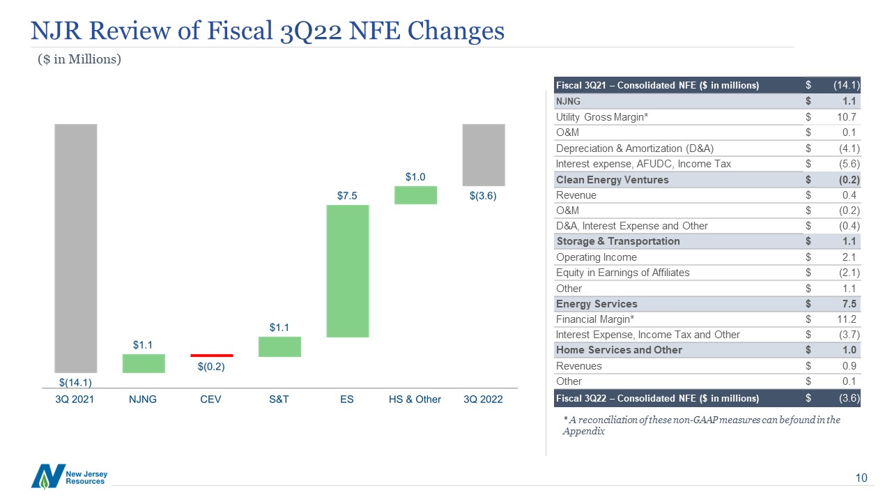 NJR Review of Fiscal 3Q22 NFE Changes  * A reconciliation of these non-GAAP measures can be found in the  Appendix  ($ in Millions)  Fiscal 3Q21 – Consolidated NFE ($ in millions)  $ (14.1)  NJNG  $ 1.1  Utility Gross Margin*  $ 10.7  O&M  $ 0.1  Depreciation & Amortization (D&A)  $ (4.1)  Interest expense, AFUDC, Income Tax  $ (5.6)  Clean Energy Ventures  $ (0.2)  Revenue  $ 0.4  O&M  $ (0.2)  D&A, Interest Expense and Other  $ (0.4)  Storage & Transportation  $ 1.1  Operating Income  $ 2.1  Equity in Earnings of Affiliates  $ (2.1)  Other  $ 1.1  Energy Services  $ 7.5  Financial Margin*  $ 11.2  Interest Expense, Income Tax and Other  $ (3.7)  Home Services and Other  $ 1.0  Revenues  $ 0.9  Other  $ 0.1  Fiscal 3Q22 – Consolidated NFE ($ in millions)  $ (3.6)  10