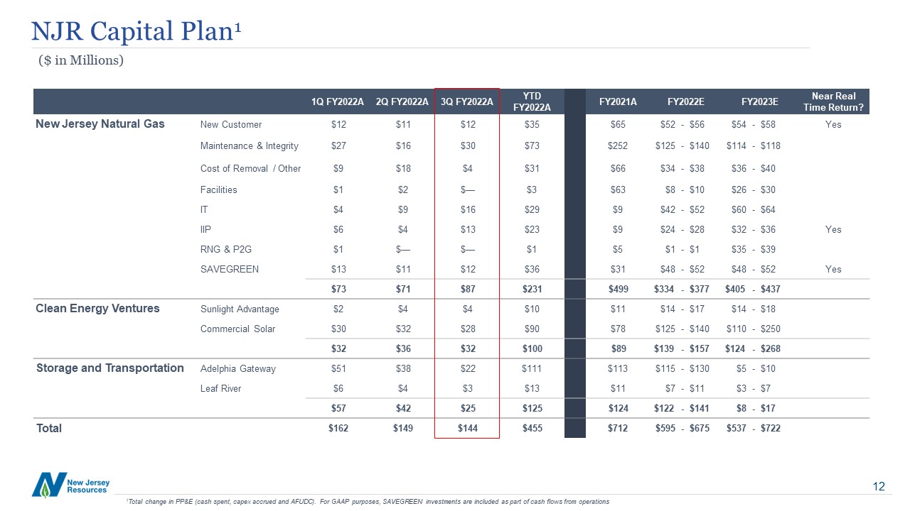 12  1Q FY2022A  2Q FY2022A  3Q FY2022A  YTD FY2022A  FY2021A  FY2022E  FY2023E  Near Real Time Return?  New Jersey Natural Gas  New Customer  $12  $11  $12  $35  $65  $52  -  $56  $54  -  $58  Yes  Maintenance & Integrity  $27  $16  $30  $73  $252  $125  -  $140  $114  -  $118  Cost of Removal / Other  $9  $18  $4  $31  $66  $34  -  $38  $36  -  $40  Facilities  $1  $2  $—  $3  $63  $8  -  $10  $26  -  $30  IT  $4  $9  $16  $29  $9  $42  -  $52  $60  -  $64  IIP  $6  $4  $13  $23  $9  $24  -  $28  $32  -  $36  Yes  RNG & P2G  $1  $—  $—  $1  $5  $1  -  $1  $35  -  $39  SAVEGREEN  $13  $11  $12  $36  $31  $48  -  $52  $48  -  $52  Yes  $73  $71  $87  $231  $499  $334  -  $377  $405  -  $437  Clean Energy Ventures  Sunlight Advantage  $2  $4  $4  $10  $11  $14  -  $17  $14  -  $18  Commercial Solar  $30  $32  $28  $90  $78  $125  -  $140  $110  -  $250  $32  $36  $32  $100  $89  $139  -  $157  $124  -  $268  Storage and Transportation  Adelphia Gateway  $51  $38  $22  $111  $113  $115  -  $130  $5  -  $10  Leaf River  $6  $4  $3  $13  $11  $7  -  $11  $3  -  $7  $57  $42  $25  $125  $124  $122  -  $141  $8  -  $17  Total  $162  $149  $144  $455  $712  $595  -  $675  $537  -  $722  NJR Capital Plan1  ($ in Millions)  1Total change in PP&E (cash spent, capex accrued and AFUDC). For GAAP purposes, SAVEGREEN investments are included as part of cash flows from operations