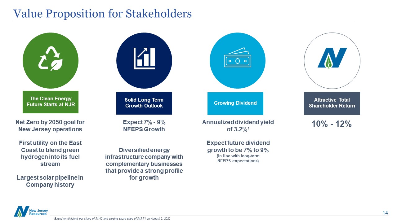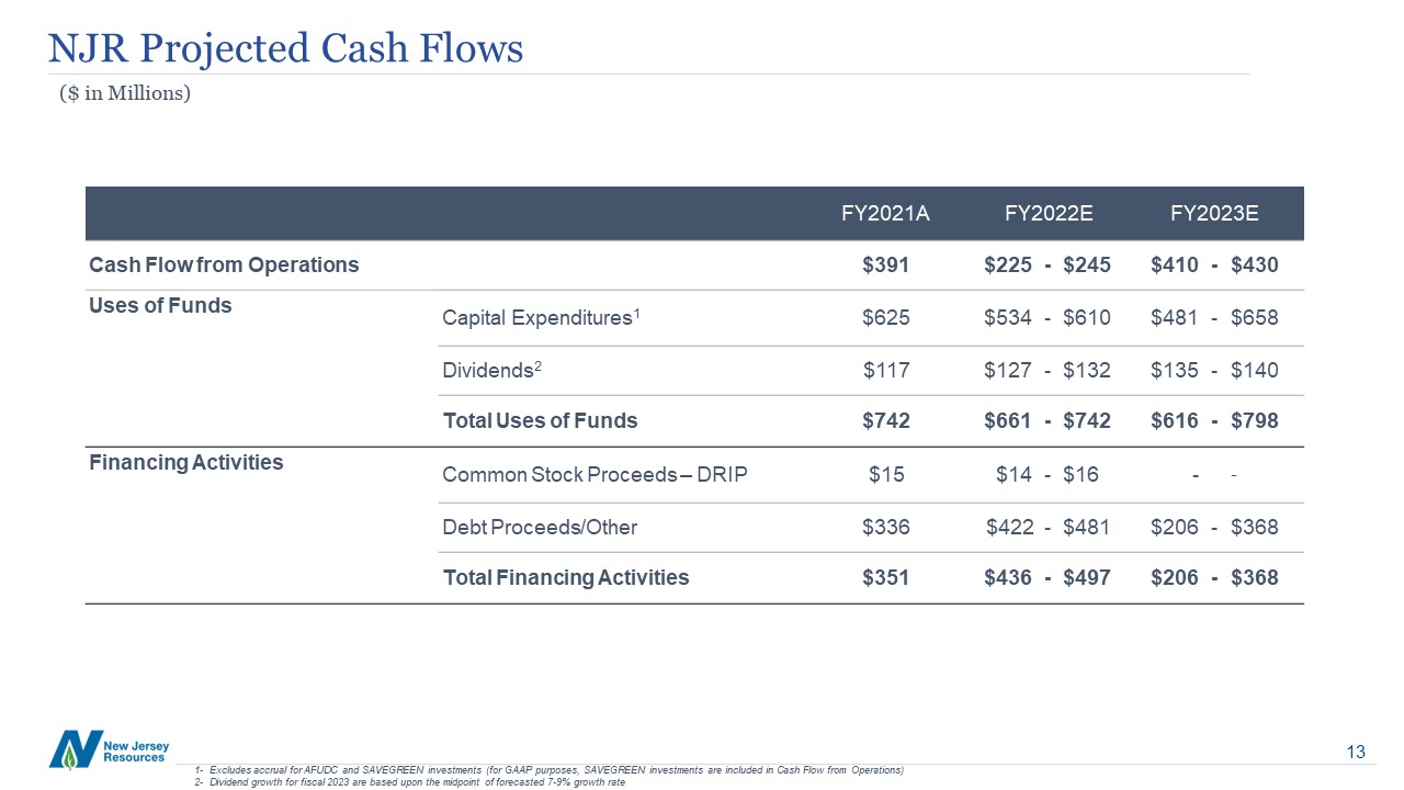 13  NJR Projected Cash Flows  ($ in Millions)  1- Excludes accrual for AFUDC and SAVEGREEN investments (for GAAP purposes, SAVEGREEN investments are included in Cash Flow from Operations) 2- Dividend growth for fiscal 2023 are based upon the midpoint of forecasted 7-9% growth rate  FY2021A  FY2022E  FY2023E  Cash Flow from Operations  $391  $225  -  $245  $410  -  $430  Uses of Funds  Capital Expenditures1  $625  $534  -  $610  $481  -  $658  Dividends2  $117  $127  -  $132  $135  -  $140  Total Uses of Funds  $742  $661  -  $742  $616  -  $798  Financing Activities  Common Stock Proceeds – DRIP  $15  $14  -  $16  -  -  Debt Proceeds/Other  $336  $422  -  $481  $206  -  $368  Total Financing Activities  $351  $436  -  $497  $206  -  $368
