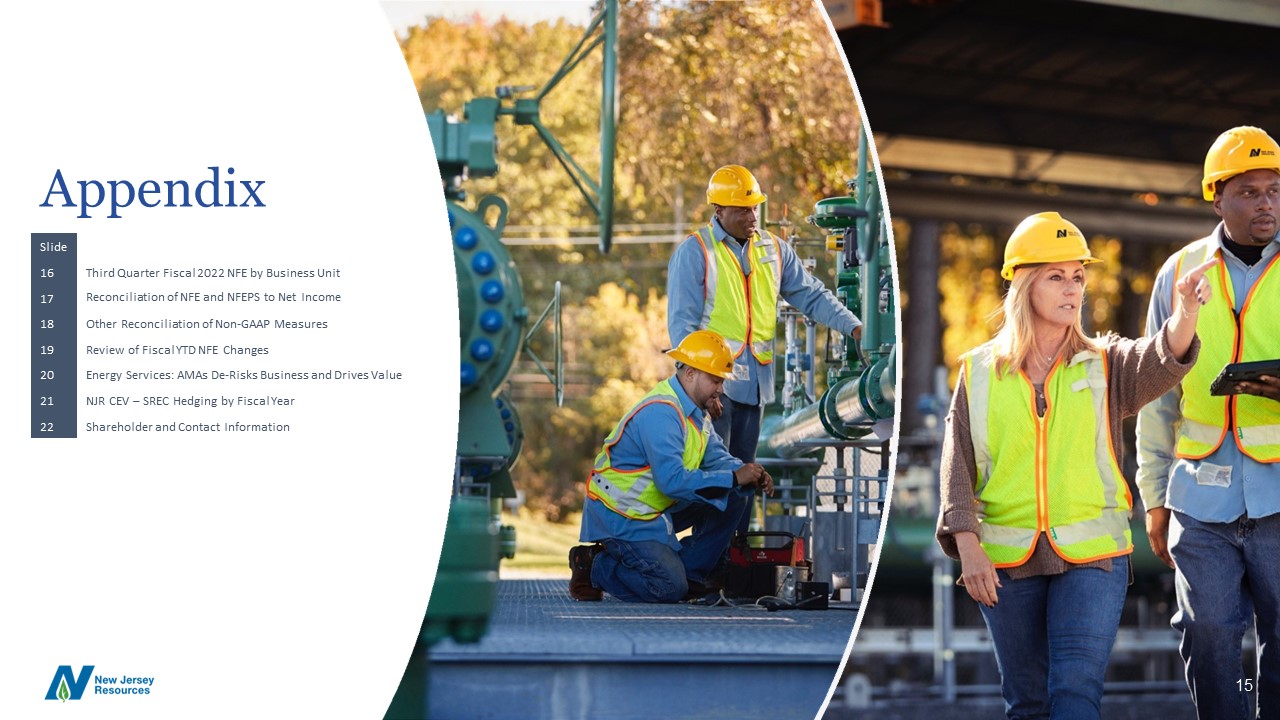 Appendix  15  Slide  16  Third Quarter Fiscal 2022 NFE by Business Unit  17  Reconciliation of NFE and NFEPS to Net Income  18  Other Reconciliation of Non-GAAP Measures  19  Review of Fiscal YTD NFE Changes  20  Energy Services: AMAs De-Risks Business and Drives Value  21  NJR CEV – SREC Hedging by Fiscal Year  22  Shareholder and Contact Information