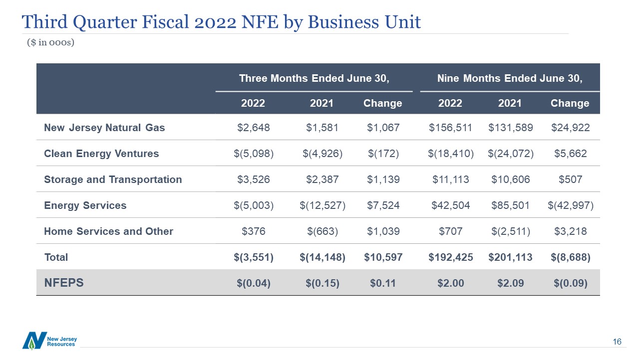 Third Quarter Fiscal 2022 NFE by Business Unit  16  ($ in 000s)  Three Months Ended June 30,  Nine Months Ended June 30,  2022  2021  Change  2022  2021  Change  New Jersey Natural Gas  $2,648  $1,581  $1,067  $156,511  $131,589  $24,922  Clean Energy Ventures  $(5,098)  $(4,926)  $(172)  $(18,410)  $(24,072)  $5,662  Storage and Transportation  $3,526  $2,387  $1,139  $11,113  $10,606  $507  Energy Services  $(5,003)  $(12,527)  $7,524  $42,504  $85,501  $(42,997)  Home Services and Other  $376  $(663)  $1,039  $707  $(2,511)  $3,218  Total  $(3,551)  $(14,148)  $10,597  $192,425  $201,113  $(8,688)  NFEPS  $(0.04)  $(0.15)  $0.11  $2.00  $2.09  $(0.09)