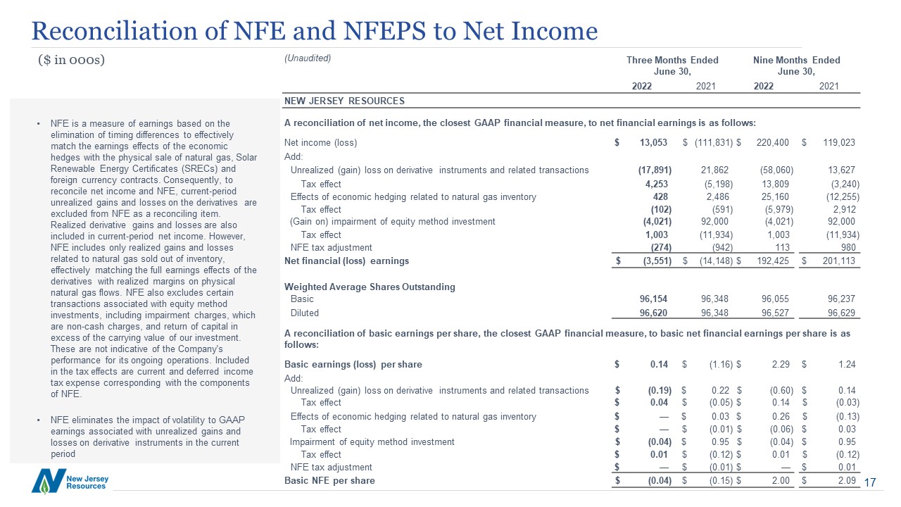 Reconciliation of NFE and NFEPS to Net Income  ($ in 000s) (Unaudited)  Three Months Ended June 30,  Nine Months Ended June 30,  2022  2021  2022  2021  NEW JERSEY RESOURCES  NFE is a measure of earnings based on the A reconciliation of net income, the closest GAAP financial measure, to net financial earnings is as follows:  elimination of timing differences to effectively  match the earnings effects of the economic Net income (loss)  $ 13,053  $ (111,831)  $ 220,400  $ 119,023  hedges with the physical sale of natural gas, Solar Add:  Renewable Energy Certificates (SRECs) and Unrealized (gain) loss on derivative instruments and related transactions  (17,891)  21,862  (58,060)  13,627  foreign currency contracts. Consequently, to Tax effect  4,253  (5,198)  13,809  (3,240)  reconcile net income and NFE, current-period Effects of economic hedging related to natural gas inventory  unrealized gains and losses on the derivatives are  428  2,486  25,160  (12,255)  excluded from NFE as a reconciling item. Tax effect  (102)  (591)  (5,979)  2,912  Realized derivative gains and losses are also (Gain on) impairment of equity method investment  (4,021)  92,000  (4,021)  92,000  included in current-period net income. However, Tax effect  1,003  (11,934)  1,003  (11,934)  NFE includes only realized gains and losses NFE tax adjustment   (274)   (942)   113    980   related to natural gas sold out of inventory, Net financial (loss) earnings  $ (3,551)  $ (14,148)  $ 192,425  $ 201,113  effectively matching the full earnings effects of the  derivatives with realized margins on physical Weighted Average Shares Outstanding  natural gas flows. NFE also excludes certain  transactions associated with equity method Basic  96,154  96,348  96,055  96,237  investments, including impairment charges, which Diluted   96,620   96,348   96,527    96,629   are non-cash charges, and return of capital in  excess of the carrying value of our investment. A reconciliation of basic earnings per share, the closest GAAP financial measure, to basic net financial earnings per share is as  These are not indicative of the Company's follows:  performance for its ongoing operations. Included Basic earnings (loss) per share  in the tax effects are current and deferred income  $ 0.14  $ (1.16)  $ 2.29  $ 1.24  tax expense corresponding with the components Add:  of NFE. Unrealized (gain) loss on derivative instruments and related transactions  $ (0.19)  $ 0.22  $ (0.60)  $ 0.14  Tax effect  $ 0.04  $ (0.05)  $ 0.14  $ (0.03)  NFE eliminates the impact of volatility to GAAP Effects of economic hedging related to natural gas inventory  $ —  $ 0.03  $ 0.26  $ (0.13)  earnings associated with unrealized gains and Tax effect  $ —  $ (0.01)  $ (0.06)  $ 0.03  losses on derivative instruments in the current Impairment of equity method investment  $ (0.04)  $ 0.95  $ (0.04)  $ 0.95  period Tax effect  $ 0.01  $ (0.12)  $ 0.01  $ (0.12)  NFE tax adjustment   $ —   $ (0.01)   $ —   $ 0.01   Basic NFE per share  $ (0.04)  $ (0.15)  $ 2.00  $ 2.09 17
