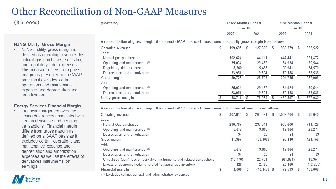 Other Reconciliation of Non-GAAP Measures  ($ in 000s)  (Unaudited)  Three Months Ended  Nine Months Ended  June 30,  June 30,  2022  2021  2022  2021  NJNG Utility Gross Margin  A reconciliation of gross margin, the closest GAAP financial measurement, to utility gross margin is as follows:  NJNG's utility gross margin is  Operating revenues  $ 199,695  $ 127,626  $ 938,279  $ 633,522  defined as operating revenues less  Less:  natural gas purchases, sales tax,  Natural gas purchases  102,624  44,111  442,441  221,872  and regulatory rider expenses.  Operating and maintenance (1)  25,034  29,437  64,924  80,544  This measure differs from gross  Regulatory rider expense  8,360  5,456  55,941  34,570  margin as presented on a GAAP  Depreciation and amortization  23,951  19,894  70,188  58,538  basis as it excludes certain  Gross margin  39,726  28,728  304,785  237,998  operations and maintenance  Add:  expense and depreciation and  Operating and maintenance (1)  25,034  29,437  64,924  80,544  amortization.  Depreciation and amortization  23,951  19,894  70,188  58,538  Utility gross margin  $ 88,711  $ 78,059  $ 439,897  $ 377,080  Energy Services Financial Margin  Financial margin removes the  A reconciliation of gross margin, the closest GAAP financial measurement, to financial margin is as follows:  timing differences associated with  Operating revenues  $ 307,815  $ 201,594  $ 1,089,704  $ 893,640  certain derivative and hedging  Less:  transactions. Financial margin  Natural Gas purchases  290,767  237,011  980,600  741,128  differs from gross margin as  Operating and maintenance (1)  5,617  3,663  12,864  28,271  defined on a GAAP basis as it  Depreciation and amortization  34  28  94  83  excludes certain operations and  Gross margin  11,397  (39,108)  96,146  124,158  maintenance expense and  Add:  depreciation and amortization  Operating and maintenance (1)  5,617  3,663  12,864  28,271  expenses as well as the effects of  Depreciation and amortization  34  28  94  83  derivatives instruments on  Unrealized (gain) loss on derivative instruments and related transactions  (16,470)  22,784  (61,671)  13,351  earnings.  Effects of economic hedging related to natural gas inventory  428  2,486  25,160  (12,255)  Financial margin  $ 1,006  $ (10,147)  $ 72,593  $ 153,608  (1) Excludes selling, general and administrative expenses  18
