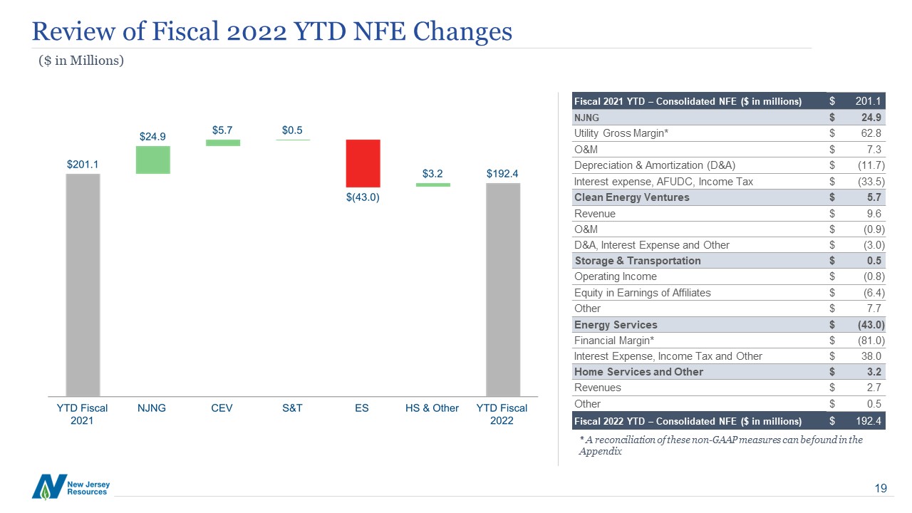 Review of Fiscal 2022 YTD NFE Changes  * A reconciliation of these non-GAAP measures can be found in the Appendix  ($ in Millions)  Fiscal 2021 YTD – Consolidated NFE ($ in millions)  $ 201.1  NJNG  $ 24.9  Utility Gross Margin*  $ 62.8  O&M  $ 7.3  Depreciation & Amortization (D&A)  $ (11.7)  Interest expense, AFUDC, Income Tax  $ (33.5)  Clean Energy Ventures  $ 5.7  Revenue  $ 9.6  O&M  $ (0.9)  D&A, Interest Expense and Other  $ (3.0)  Storage & Transportation  $ 0.5  Operating Income  $ (0.8)  Equity in Earnings of Affiliates  $ (6.4)  Other  $ 7.7  Energy Services  $ (43.0)  Financial Margin*  $ (81.0)  Interest Expense, Income Tax and Other  $ 38.0  Home Services and Other  $ 3.2  Revenues  $ 2.7  Other  $ 0.5  Fiscal 2022 YTD – Consolidated NFE ($ in millions)  $ 192.4  19