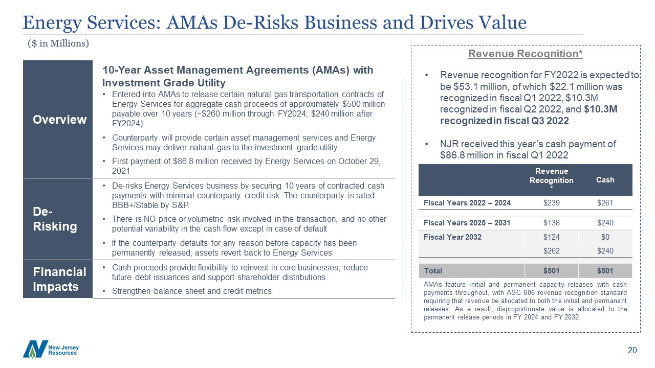 Energy Services: AMAs De-Risks Business and Drives Value  AMAs feature initial and permanent capacity releases with cash payments throughout, with ASC 606 revenue recognition standard requiring that revenue be allocated to both the initial and permanent releases. As a result, disproportionate value is allocated to the permanent release periods in FY 2024 and FY 2032.  Revenue  Recognition  *  Cash  Fiscal Years 2022 – 2024  $239  $261  Fiscal Years 2025 – 2031  $138  $240  Fiscal Year 2032  $124  $0  $262  $240  Total  $501  $501  ($ in Millions)  Overview  10-Year Asset Management Agreements (AMAs) with Investment Grade Utility  Entered into AMAs to release certain natural gas transportation contracts of Energy Services for aggregate cash proceeds of approximately $500 million payable over 10 years (~$260 million through FY2024; $240 million after FY2024)  Counterparty will provide certain asset management services and Energy  Services may deliver natural gas to the investment grade utility  First payment of $86.8 million received by Energy Services on October 29, 2021  De-  Risking  De-risks Energy Services business by securing 10 years of contracted cash payments with minimal counterparty credit risk. The counterparty is rated BBB+/Stable by S&P.  There is NO price or volumetric risk involved in the transaction, and no other  potential variability in the cash flow except in case of default  If the counterparty defaults for any reason before capacity has been permanently released, assets revert back to Energy Services  Financial Impacts  Cash proceeds provide flexibility to reinvest in core businesses, reduce future debt issuances and support shareholder distributions  Strengthen balance sheet and credit metrics  Revenue Recognition*  Revenue recognition for FY2022 is expected to be $53.1 million, of which $22.1 million was recognized in fiscal Q1 2022, $10.3M recognized in fiscal Q2 2022, and $10.3M recognized in fiscal Q3 2022  NJR received this year’s cash payment of  $86.8 million in fiscal Q1 2022  20