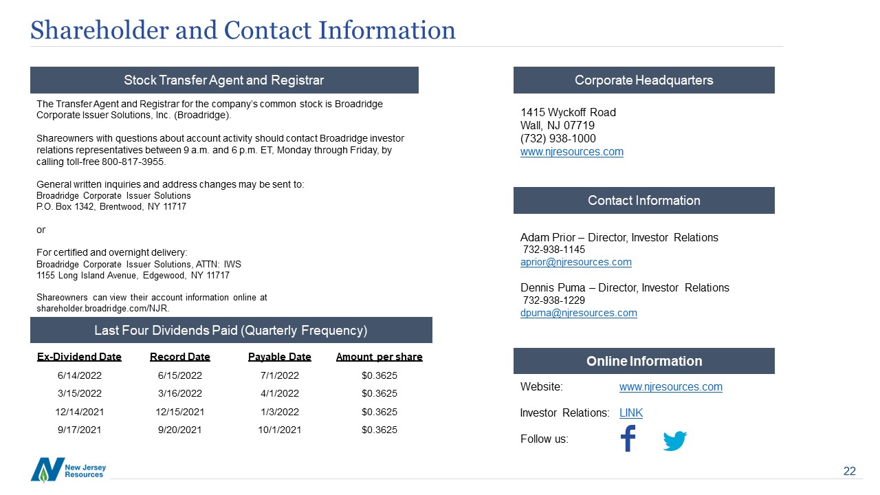 Shareholder and Contact Information   1415 Wyckoff Road  Wall, NJ 07719  (732) 938-1000  www.njresources.com  Corporate Headquarters  Contact Information  The Transfer Agent and Registrar for the company’s common stock is Broadridge Corporate Issuer Solutions, Inc. (Broadridge).  Shareowners with questions about account activity should contact Broadridge investor relations representatives between 9 a.m. and 6 p.m. ET, Monday through Friday, by calling toll-free 800-817-3955.  General written inquiries and address changes may be sent to:  Broadridge Corporate Issuer Solutions  P.O. Box 1342, Brentwood, NY 11717  or  For certified and overnight delivery:  Broadridge Corporate Issuer Solutions, ATTN: IWS 1155 Long Island Avenue, Edgewood, NY 11717  Shareowners can view their account information online at shareholder.broadridge.com/NJR.  Stock Transfer Agent and Registrar  Adam Prior – Director, Investor Relations  732-938-1145  aprior@njresources.com  Dennis Puma – Director, Investor Relations  732-938-1229  dpuma@njresources.com  Last Four Dividends Paid (Quarterly Frequency)  Ex-Dividend Date  Record Date  Payable Date  Amount per share  6/14/2022  6/15/2022  7/1/2022  $0.3625  3/15/2022  3/16/2022  4/1/2022  $0.3625  12/14/2021  12/15/2021  1/3/2022  $0.3625  9/17/2021  9/20/2021  10/1/2021  $0.3625  Online Information  Website: www.njresources.com  Investor Relations: LINK Follow us:  22