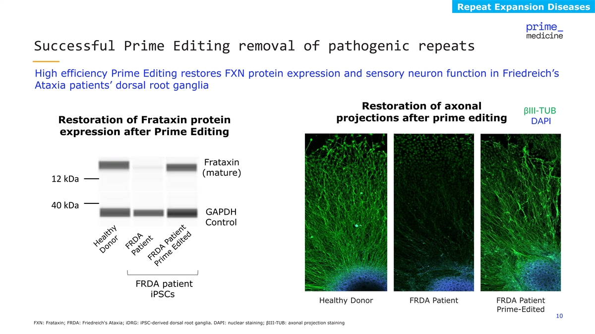 Repeat Expansion Diseases Successful Prime Editing removal of pathogenic repeats High efficiency Prime Editing restores FXN protein expression and sensory neuron function in Friedreich’s Ataxia patients’ dorsal root ganglia Restoration of axonal βIII-TUB projections after prime editing Restoration of Frataxin protein DAPI expression after Prime Editing Frataxin (mature) 12 kDa 40 kDa GAPDH Control FRDA patient iPSCs Healthy Donor FRDA Patient FRDA Patient Prime-Edited 10 FXN: Frataxin; FRDA: Friedreich's Ataxia; iDRG: iPSC-derived dorsal root ganglia. DAPI: nuclear staining; βIII-TUB: axonal projection staining