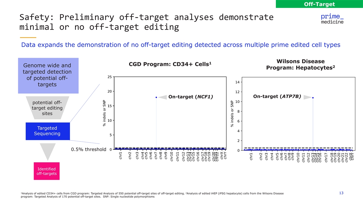 Off-Target Safety: Prime’s comprehensive suite of assays for off- target discovery* GGCCCAG-CTGAGCTCGTGA Local off-targets Chromosome scale or structural off-targets Off-target PE2 GGCCCAGACTGAGCACGTGA Translocations PE2 cDNA synthesis genome On-target Large Deletions Reverse Trans. Assay Chromosomal Integrity Assays Targeted Nick Genome wide Genome wide Nick ** ** Detection Assay DSB detection Detection Assay mRNAseq Imaging Sequencing based PEG integration potential off-target editing sites Whole Genome Vector Integration Sequencing Analysis Targeted Sequencing (>1000x) Identified Identified Off-targets Off-targets * ** 12 Preliminary plans pending discussions with regulatory agencies; Proprietary assay developed by Prime