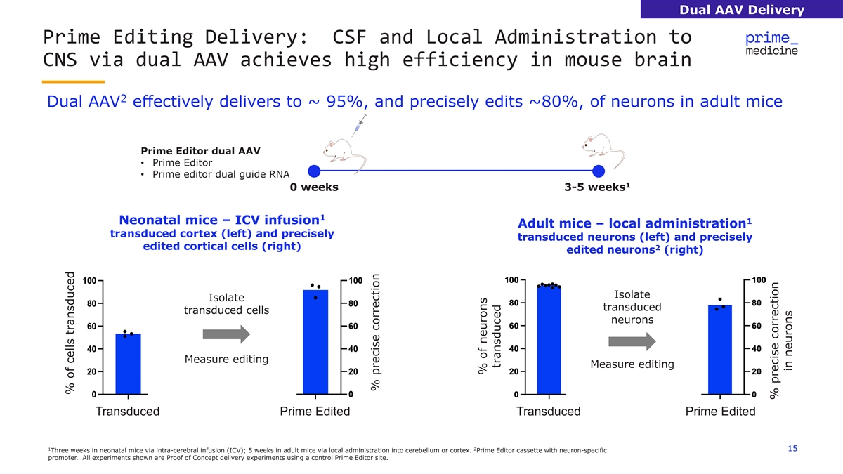 Dual AAV Delivery Prime Editing Delivery: CSF and Local Administration to CNS via dual AAV achieves high efficiency in mouse brain 2 Dual AAV effectively delivers to ~ 95%, and precisely edits ~80%, of neurons in adult mice Prime Editor dual AAV • Prime Editor • Prime editor dual guide RNA 1 0 weeks 3-5 weeks 1 1 Neonatal mice – ICV infusion Adult mice – local administration transduced cortex (left) and precisely transduced neurons (left) and precisely edited cortical cells (right) 2 edited neurons (right) Isolate Isolate transduced transduced cells neurons Measure editing Measure editing Transduced Prime Edited Transduced Prime Edited 1 2 15 Three weeks in neonatal mice via intra-cerebral infusion (ICV); 5 weeks in adult mice via local administration into cerebellum or cortex. Prime Editor cassette with neuron-specific promoter. All experiments shown are Proof of Concept delivery experiments using a control Prime Editor site. % of cells transduced % precise correction % of neurons transduced % precise correction in neurons