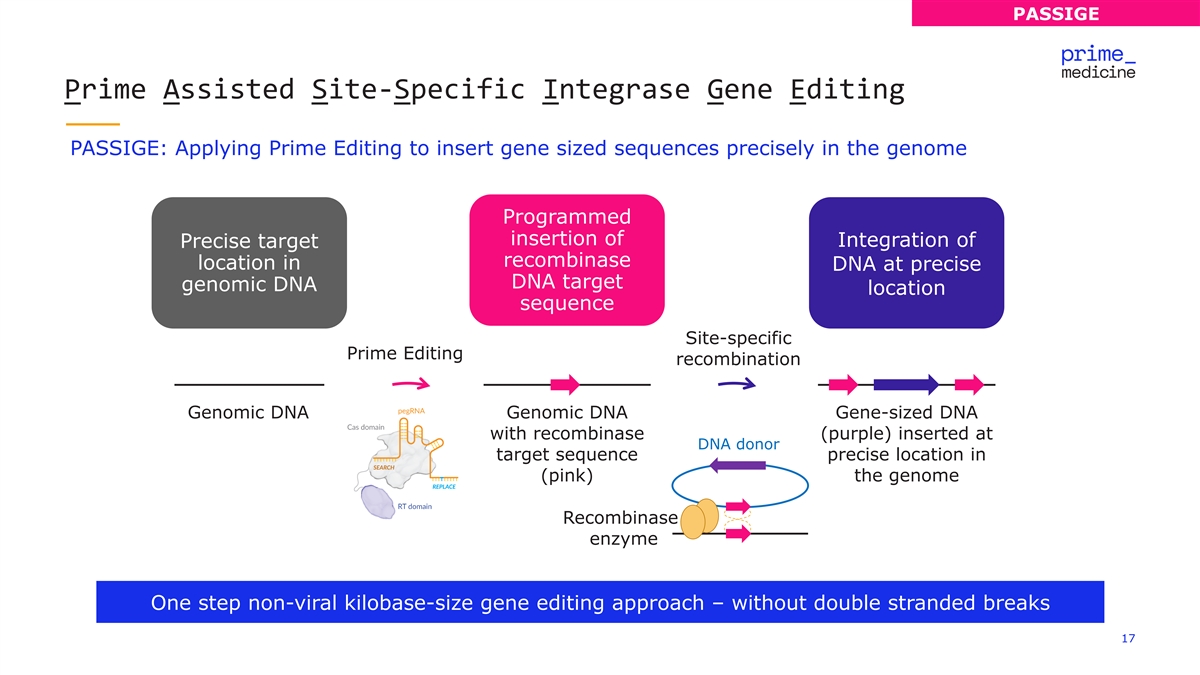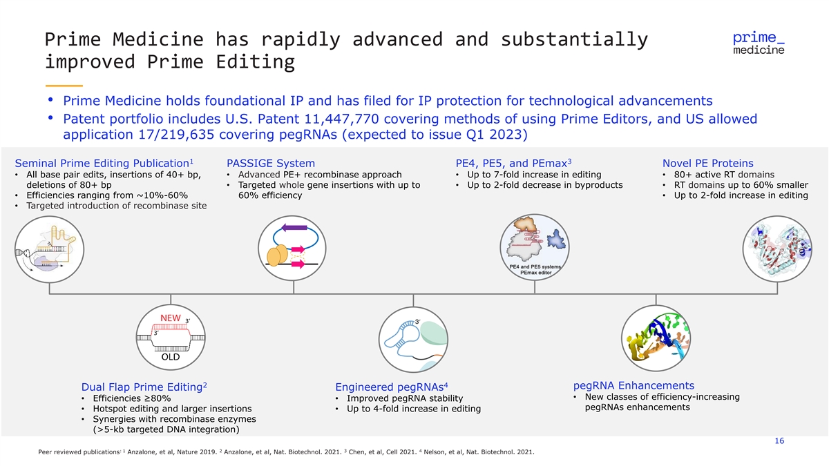 Prime Medicine has rapidly advanced and substantially improved Prime Editing • Prime Medicine holds foundational IP and has filed for IP protection for technological advancements • Patent portfolio includes U.S. Patent 11,447,770 covering methods of using Prime Editors, and US allowed application 17/219,635 covering pegRNAs (expected to issue Q1 2023) 1 3 Seminal Prime Editing Publication PASSIGE System PE4, PE5, and PEmax Novel PE Proteins • All base pair edits, insertions of 40+ bp, • Advanced PE+ recombinase approach• Up to 7-fold increase in editing• 80+ active RT domains deletions of 80+ bp• Targeted whole gene insertions with up to • Up to 2-fold decrease in byproducts• RT domains up to 60% smaller • Efficiencies ranging from ~10%-60% 60% efficiency• Up to 2-fold increase in editing • Targeted introduction of recombinase site 2 4 pegRNA Enhancements Dual Flap Prime Editing Engineered pegRNAs • New classes of efficiency-increasing • Efficiencies ≥80%• Improved pegRNA stability pegRNAs enhancements • Hotspot editing and larger insertions• Up to 4-fold increase in editing • Synergies with recombinase enzymes (>5-kb targeted DNA integration) 16 : 1 2 3 4 Peer reviewed publications Anzalone, et al, Nature 2019. Anzalone, et al, Nat. Biotechnol. 2021. Chen, et al, Cell 2021. Nelson, et al, Nat. Biotechnol. 2021.
