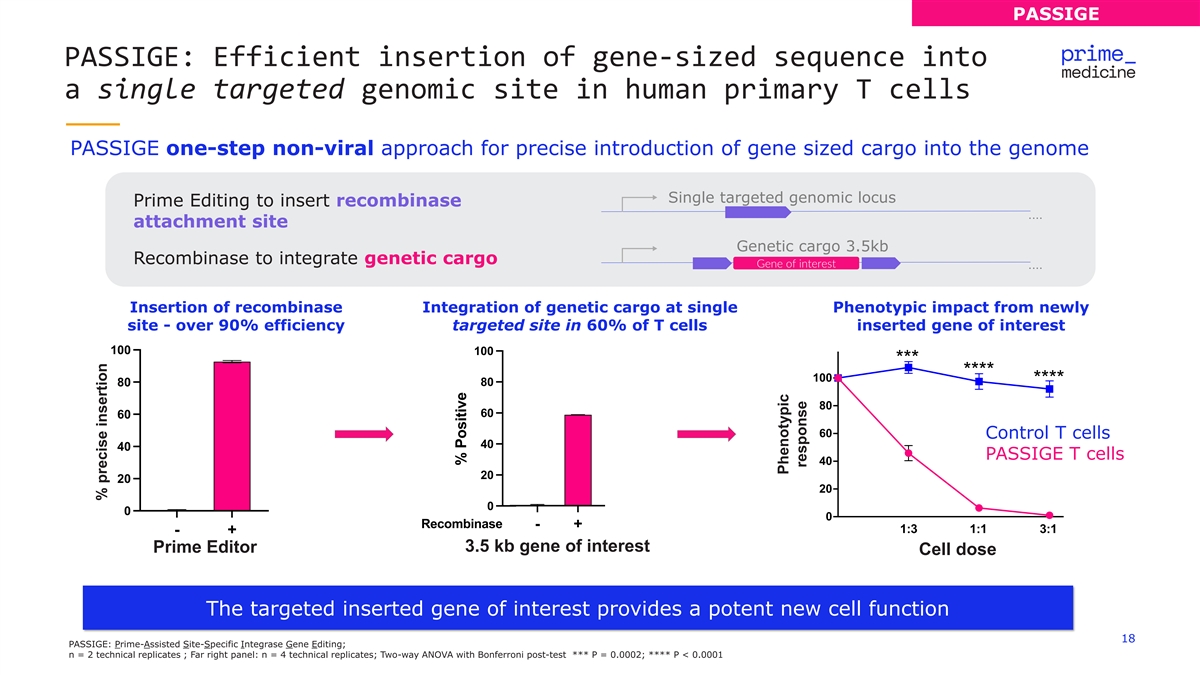 PASSIGE Prime Assisted Site-Specific Integrase Gene Editing PASSIGE: Applying Prime Editing to insert gene sized sequences precisely in the genome Programmed insertion of Integration of Precise target recombinase location in DNA at precise DNA target genomic DNA location sequence Site-specific Prime Editing recombination Genomic DNA Genomic DNA Gene-sized DNA with recombinase (purple) inserted at DNA donor target sequence precise location in (pink) the genome Recombinase enzyme One step non-viral kilobase-size gene editing approach – without double stranded breaks 17