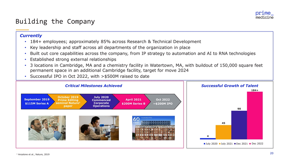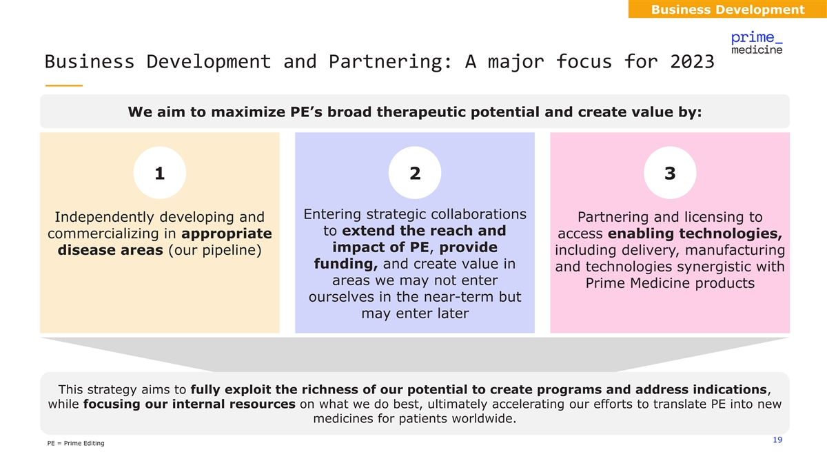 Business Development Business Development and Partnering: A major focus for 2023 We aim to maximize PE’s broad therapeutic potential and create value by: 1 2 3 Entering strategic collaborations Independently developing and Partnering and licensing to to extend the reach and commercializing in appropriate access enabling technologies, impact of PE, provide disease areas (our pipeline) including delivery, manufacturing funding, and create value in and technologies synergistic with areas we may not enter Prime Medicine products ourselves in the near-term but may enter later This strategy aims to fully exploit the richness of our potential to create programs and address indications, while focusing our internal resources on what we do best, ultimately accelerating our efforts to translate PE into new medicines for patients worldwide. 19 PE = Prime Editing