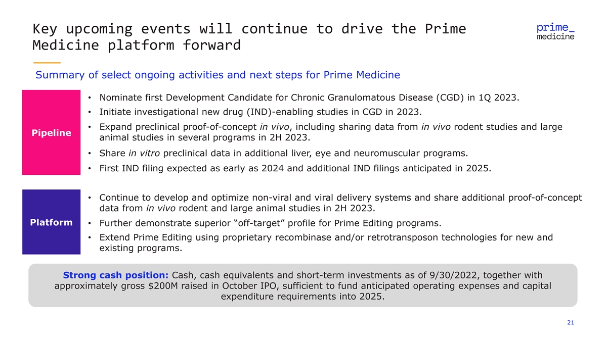 Building the Company Currently • 184+ employees; approximately 85% across Research & Technical Development • Key leadership and staff across all departments of the organization in place • Built out core capabilities across the company, from IP strategy to automation and AI to RNA technologies • Established strong external relationships • 3 locations in Cambridge, MA and a chemistry facility in Watertown, MA, with buildout of 150,000 square feet permanent space in an additional Cambridge facility, target for move 2024 • Successful IPO in Oct 2022, with >$500M raised to date Critical Milestones Achieved Successful Growth of Talent 184+ October 2019 July 2020 September 2019 April 2021 Oct 2022 Prime Editing Commenced 1 seminal Nature Corporate $115M Series A $200M Series B ~$200M IPO paper Operations 90 45 4 Dec 2022 July 2020 July 2021 Dec 2021 July 2022 20 1 Anzalone et al., Nature, 2019