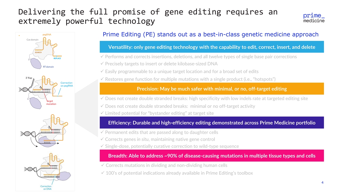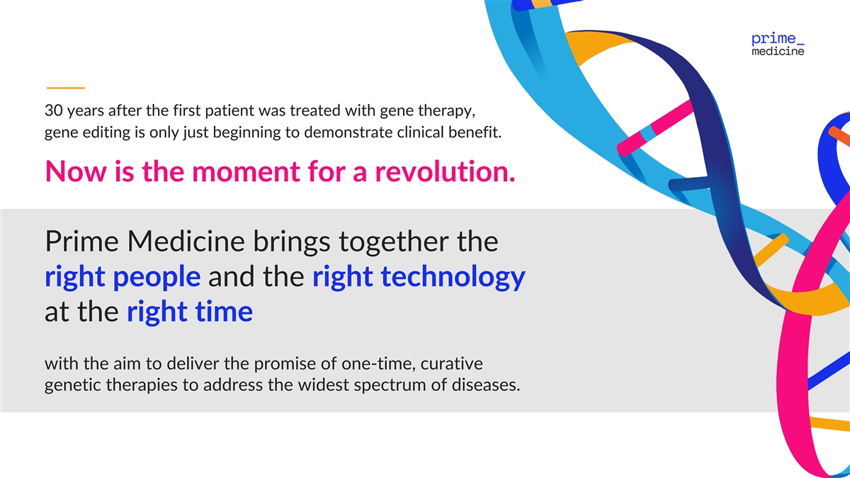 30 years after the first patient was treated with gene therapy, gene editing is only just beginning to demonstrate clinical benefit. Now is the moment for a revolution. Prime Medicine brings together the right people and the right technology at the right time with the aim to deliver the promise of one-time, curative genetic therapies to address the widest spectrum of diseases. 3