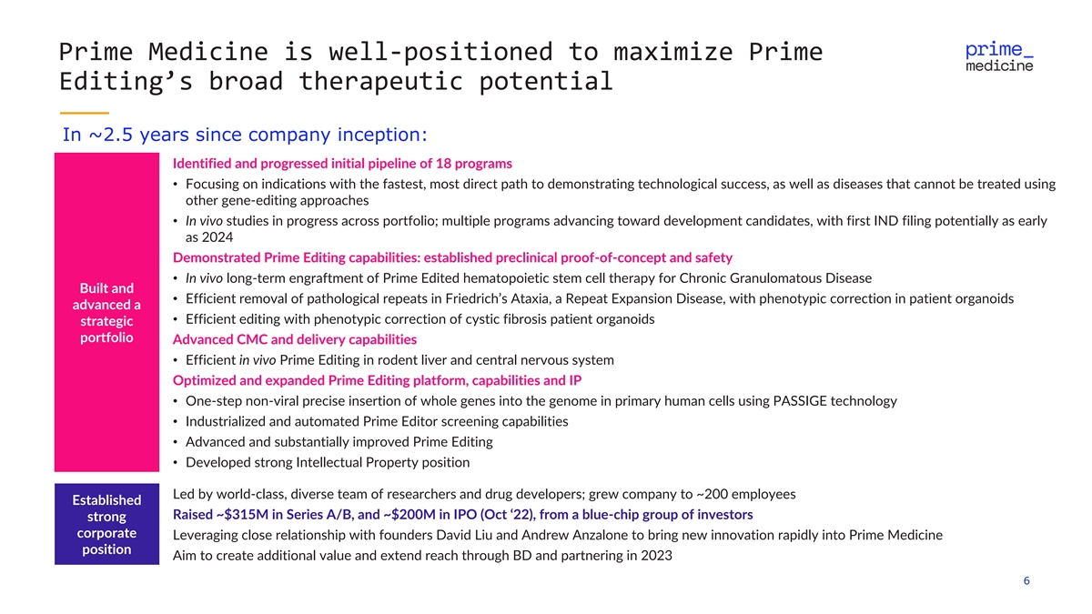 Delivering the full promise of gene editing requires an extremely powerful technology Prime Editing (PE) stands out as a best-in-class genetic medicine approach Versatility: only gene editing technology with the capability to edit, correct, insert, and delete ✓ Performs and corrects insertions, deletions, and all twelve types of single base pair corrections ✓ Precisely targets to insert or delete kilobase-sized DNA ✓ Easily programmable to a unique target location and for a broad set of edits ✓ Restores gene function for multiple mutations with a single product (i.e., “hotspots”) Precision: May be much safer with minimal, or no, off-target editing ✓ Does not create double stranded breaks: high specificity with low indels rate at targeted editing site ✓ Does not create double stranded breaks: minimal or no off-target activity ✓ Limited potential for “bystander editing” at target site Efficiency: Durable and high-efficiency editing demonstrated across Prime Medicine portfolio ✓ Permanent edits that are passed along to daughter cells ✓ Corrects genes in situ, maintaining native gene control ✓ Single-dose, potentially curative correction to wild-type sequence Breadth: Able to address ~90% of disease-causing mutations in multiple tissue types and cells ✓ Corrects mutations in dividing and non-dividing human cells ✓ 100’s of potential indications already available in Prime Editing’s toolbox 5