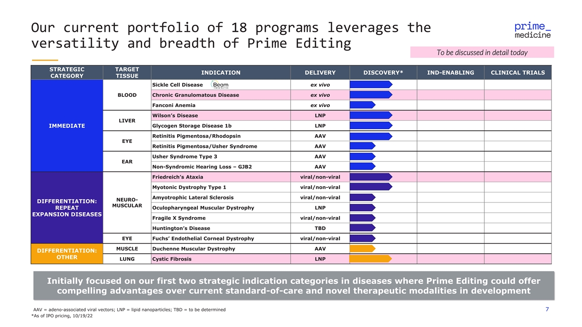Prime Medicine is well-positioned to maximize Prime Editing’s broad therapeutic potential In ~2.5 years since company inception: Identified and progressed initial pipeline of 18 programs • Focusing on indications with the fastest, most direct path to demonstrating technological success, as well as diseases that cannot be treated using other gene-editing approaches • In vivo studies in progress across portfolio; multiple programs advancing toward development candidates, with first IND filing potentially as early as 2024 Demonstrated Prime Editing capabilities: established preclinical proof-of-concept and safety • In vivo long-term engraftment of Prime Edited hematopoietic stem cell therapy for Chronic Granulomatous Disease Built and • Efficient removal of pathological repeats in Friedrich’s Ataxia, a Repeat Expansion Disease, with phenotypic correction in patient organoids advanced a • Efficient editing with phenotypic correction of cystic fibrosis patient organoids strategic portfolio Advanced CMC and delivery capabilities • Efficient in vivo Prime Editing in rodent liver and central nervous system Optimized and expanded Prime Editing platform, capabilities and IP • One-step non-viral precise insertion of whole genes into the genome in primary human cells using PASSIGE technology • Industrialized and automated Prime Editor screening capabilities • Advanced and substantially improved Prime Editing • Developed strong Intellectual Property position Led by world-class, diverse team of researchers and drug developers; grew company to ~200 employees Established Raised ~$315M in Series A/B, and ~$200M in IPO (Oct ‘22), from a blue-chip group of investors strong corporate Leveraging close relationship with founders David Liu and Andrew Anzalone to bring new innovation rapidly into Prime Medicine position Aim to create additional value and extend reach through BD and partnering in 2023 6