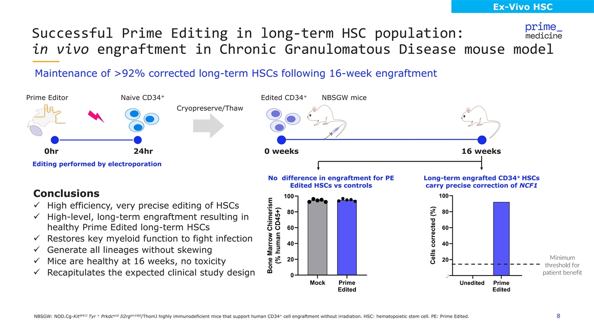 Ex-Vivo HSC Successful Prime Editing in long-term HSC population: in vivo engraftment in Chronic Granulomatous Disease mouse model Maintenance of >92% corrected long-term HSCs following 16-week engraftment + + Prime Editor Naive CD34 Edited CD34 NBSGW mice Cryopreserve/Thaw 0hr 24hr 0 weeks 16 weeks Editing performed by electroporation + No difference in engraftment for PE Long-term engrafted CD34 HSCs Edited HSCs vs controls carry precise correction of NCF1 Conclusions 100 100 ✓ High efficiency, very precise editing of HSCs 80 80 ✓ High-level, long-term engraftment resulting in 60 60 healthy Prime Edited long-term HSCs ✓ Restores key myeloid function to fight infection 40 40 ✓ Generate all lineages without skewing Minimum 20 20 ✓ Mice are healthy at 16 weeks, no toxicity threshold for patient benefit ✓ Recapitulates the expected clinical study design 0 0 Mock Prime Unedited Prime Edited Edited W41J + scid tm1Wjl + NBSGW: NOD.Cg-Kit Tyr Prkdc Il2rg /ThomJ highly immunodeficient mice that support human CD34 cell engraftment without irradiation. HSC: hematopoietic stem cell. PE: Prime Edited. 8 Bone Marrow Chimerism (% human CD45+) Cells corrected (%)