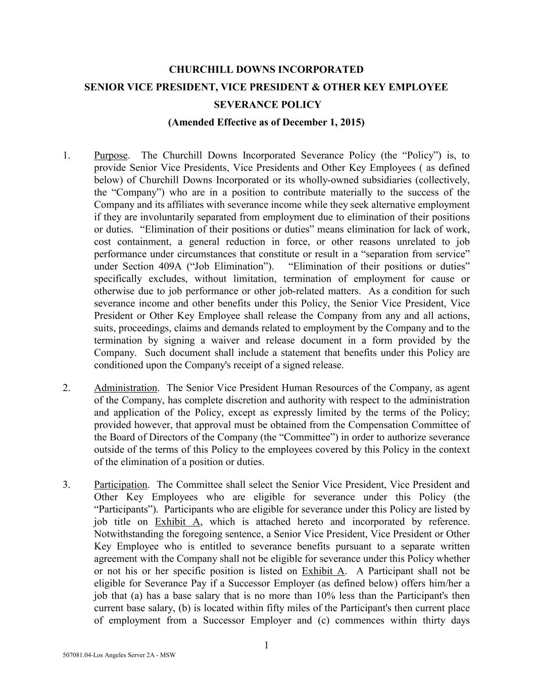 1 507081.04-Los Angeles Server 2A - MSW CHURCHILL DOWNS INCORPORATED SENIOR VICE PRESIDENT, VICE PRESIDENT & OTHER KEY EMPLOYEE SEVERANCE POLICY (Amended Effective as of December 1, 2015) 1. Purpose. The Churchill Downs Incorporated Severance Policy (the “Policy”) is, to provide Senior Vice Presidents, Vice Presidents and Other Key Employees ( as defined below) of Churchill Downs Incorporated or its wholly-owned subsidiaries (collectively, the “Company”) who are in a position to contribute materially to the success of the Company and its affiliates with severance income while they seek alternative employment if they are involuntarily separated from employment due to elimination of their positions or duties. “Elimination of their positions or duties” means elimination for lack of work, cost containment, a general reduction in force, or other reasons unrelated to job performance under circumstances that constitute or result in a “separation from service” under Section 409A (“Job Elimination”). “Elimination of their positions or duties” specifically excludes, without limitation, termination of employment for cause or otherwise due to job performance or other job-related matters. As a condition for such severance income and other benefits under this Policy, the Senior Vice President, Vice President or Other Key Employee shall release the Company from any and all actions, suits, proceedings, claims and demands related to employment by the Company and to the termination by signing a waiver and release document in a form provided by the Company. Such document shall include a statement that benefits under this Policy are conditioned upon the Company's receipt of a signed release. 2. Administration. The Senior Vice President Human Resources of the Company, as agent of the Company, has complete discretion and authority with respect to the administration and application of the Policy, except as expressly limited by the terms of the Policy; provided however, that approval must be obtained from the Compensation Committee of the Board of Directors of the Company (the “Committee”) in order to authorize severance outside of the terms of this Policy to the employees covered by this Policy in the context of the elimination of a position or duties. 3. Participation. The Committee shall select the Senior Vice President, Vice President and Other Key Employees who are eligible for severance under this Policy (the “Participants”). Participants who are eligible for severance under this Policy are listed by job title on Exhibit A, which is attached hereto and incorporated by reference. Notwithstanding the foregoing sentence, a Senior Vice President, Vice President or Other Key Employee who is entitled to severance benefits pursuant to a separate written agreement with the Company shall not be eligible for severance under this Policy whether or not his or her specific position is listed on Exhibit A. A Participant shall not be eligible for Severance Pay if a Successor Employer (as defined below) offers him/her a job that (a) has a base salary that is no more than 10% less than the Participant's then current base salary, (b) is located within fifty miles of the Participant's then current place of employment from a Successor Employer and (c) commences within thirty days
