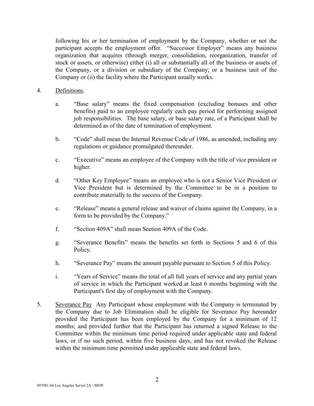 2 507081.04-Los Angeles Server 2A - MSW following his or her termination of employment by the Company, whether or not the participant accepts the employment offer. “Successor Employer” means any business organization that acquires (through merger, consolidation, reorganization, transfer of stock or assets, or otherwise) either (i) all or substantially all of the business or assets of the Company, or a division or subsidiary of the Company; or a business unit of the Company or (ii) the facility where the Participant usually works. 4. Definitions. a. “Base salary” means the fixed compensation (excluding bonuses and other benefits) paid to an employee regularly each pay period for performing assigned job responsibilities. The base salary, or base salary rate, of a Participant shall be determined as of the date of termination of employment. b. “Code” shall mean the Internal Revenue Code of 1986, as amended, including any regulations or guidance promulgated thereunder. c. “Executive” means an employee of the Company with the title of vice president or higher. d. “Other Key Employee” means an employee who is not a Senior Vice President or Vice President but is determined by the Committee to be in a position to contribute materially to the success of the Company. e. “Release” means a general release and waiver of claims against the Company, in a form to be provided by the Company.” f. “Section 409A” shall mean Section 409A of the Code. g. “Severance Benefits” means the benefits set forth in Sections 5 and 6 of this Policy. h. “Severance Pay” means the amount payable pursuant to Section 5 of this Policy. i. “Years of Service” means the total of all full years of service and any partial years of service in which the Participant worked at least 6 months beginning with the Participant's first day of employment with the Company. 5. Severance Pay Any Participant whose employment with the Company is terminated by the Company due to Job Elimination shall be eligible for Severance Pay hereunder provided the Participant has been employed by the Company for a minimum of 12 months; and provided further that the Participant has returned a signed Release to the Committee within the minimum time period required under applicable state and federal laws, or if no such period, within five business days, and has not revoked the Release within the minimum time permitted under applicable state and federal laws.