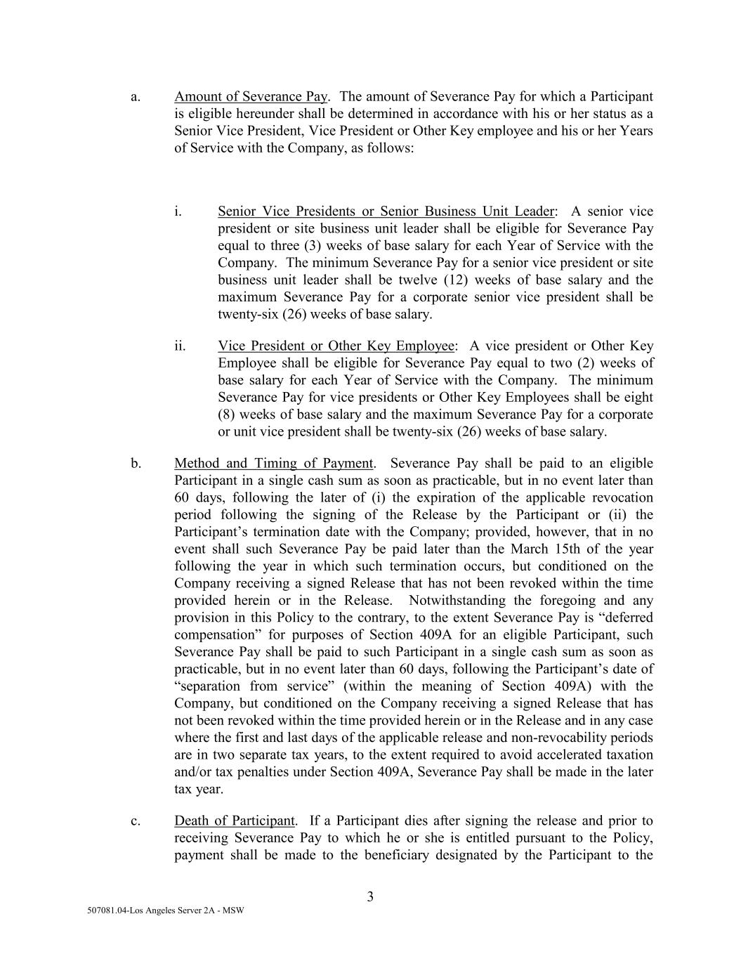 3 507081.04-Los Angeles Server 2A - MSW a. Amount of Severance Pay. The amount of Severance Pay for which a Participant is eligible hereunder shall be determined in accordance with his or her status as a Senior Vice President, Vice President or Other Key employee and his or her Years of Service with the Company, as follows: i. Senior Vice Presidents or Senior Business Unit Leader: A senior vice president or site business unit leader shall be eligible for Severance Pay equal to three (3) weeks of base salary for each Year of Service with the Company. The minimum Severance Pay for a senior vice president or site business unit leader shall be twelve (12) weeks of base salary and the maximum Severance Pay for a corporate senior vice president shall be twenty-six (26) weeks of base salary. ii. Vice President or Other Key Employee: A vice president or Other Key Employee shall be eligible for Severance Pay equal to two (2) weeks of base salary for each Year of Service with the Company. The minimum Severance Pay for vice presidents or Other Key Employees shall be eight (8) weeks of base salary and the maximum Severance Pay for a corporate or unit vice president shall be twenty-six (26) weeks of base salary. b. Method and Timing of Payment. Severance Pay shall be paid to an eligible Participant in a single cash sum as soon as practicable, but in no event later than 60 days, following the later of (i) the expiration of the applicable revocation period following the signing of the Release by the Participant or (ii) the Participant’s termination date with the Company; provided, however, that in no event shall such Severance Pay be paid later than the March 15th of the year following the year in which such termination occurs, but conditioned on the Company receiving a signed Release that has not been revoked within the time provided herein or in the Release. Notwithstanding the foregoing and any provision in this Policy to the contrary, to the extent Severance Pay is “deferred compensation” for purposes of Section 409A for an eligible Participant, such Severance Pay shall be paid to such Participant in a single cash sum as soon as practicable, but in no event later than 60 days, following the Participant’s date of “separation from service” (within the meaning of Section 409A) with the Company, but conditioned on the Company receiving a signed Release that has not been revoked within the time provided herein or in the Release and in any case where the first and last days of the applicable release and non-revocability periods are in two separate tax years, to the extent required to avoid accelerated taxation and/or tax penalties under Section 409A, Severance Pay shall be made in the later tax year. c. Death of Participant. If a Participant dies after signing the release and prior to receiving Severance Pay to which he or she is entitled pursuant to the Policy, payment shall be made to the beneficiary designated by the Participant to the