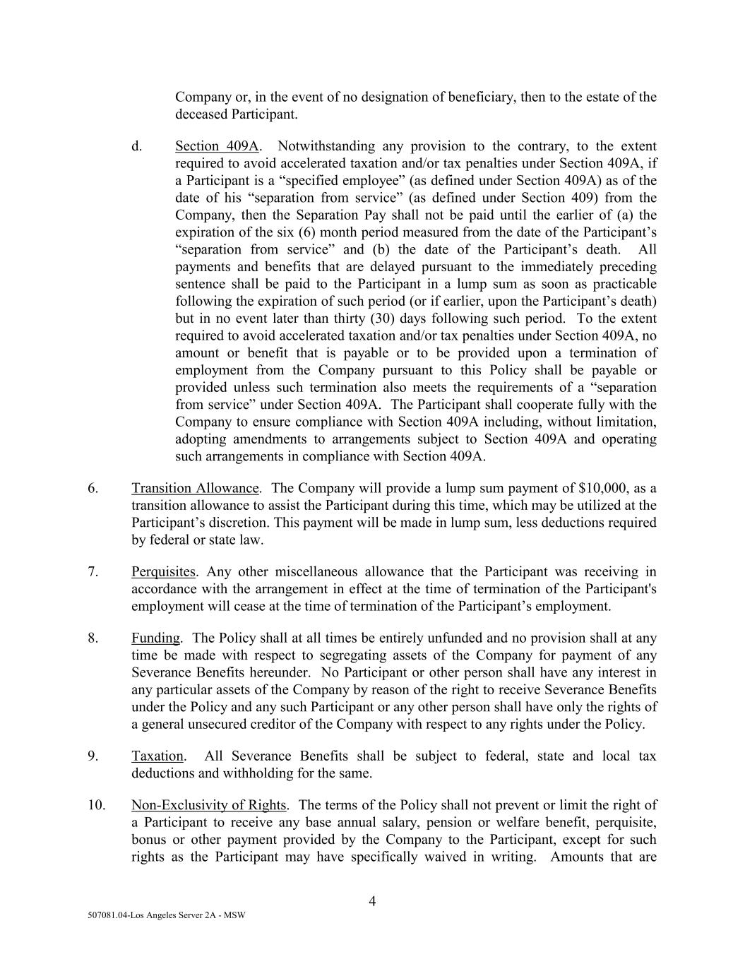 4 507081.04-Los Angeles Server 2A - MSW Company or, in the event of no designation of beneficiary, then to the estate of the deceased Participant. d. Section 409A. Notwithstanding any provision to the contrary, to the extent required to avoid accelerated taxation and/or tax penalties under Section 409A, if a Participant is a “specified employee” (as defined under Section 409A) as of the date of his “separation from service” (as defined under Section 409) from the Company, then the Separation Pay shall not be paid until the earlier of (a) the expiration of the six (6) month period measured from the date of the Participant’s “separation from service” and (b) the date of the Participant’s death. All payments and benefits that are delayed pursuant to the immediately preceding sentence shall be paid to the Participant in a lump sum as soon as practicable following the expiration of such period (or if earlier, upon the Participant’s death) but in no event later than thirty (30) days following such period. To the extent required to avoid accelerated taxation and/or tax penalties under Section 409A, no amount or benefit that is payable or to be provided upon a termination of employment from the Company pursuant to this Policy shall be payable or provided unless such termination also meets the requirements of a “separation from service” under Section 409A. The Participant shall cooperate fully with the Company to ensure compliance with Section 409A including, without limitation, adopting amendments to arrangements subject to Section 409A and operating such arrangements in compliance with Section 409A. 6. Transition Allowance. The Company will provide a lump sum payment of $10,000, as a transition allowance to assist the Participant during this time, which may be utilized at the Participant’s discretion. This payment will be made in lump sum, less deductions required by federal or state law. 7. Perquisites. Any other miscellaneous allowance that the Participant was receiving in accordance with the arrangement in effect at the time of termination of the Participant's employment will cease at the time of termination of the Participant’s employment. 8. Funding. The Policy shall at all times be entirely unfunded and no provision shall at any time be made with respect to segregating assets of the Company for payment of any Severance Benefits hereunder. No Participant or other person shall have any interest in any particular assets of the Company by reason of the right to receive Severance Benefits under the Policy and any such Participant or any other person shall have only the rights of a general unsecured creditor of the Company with respect to any rights under the Policy. 9. Taxation. All Severance Benefits shall be subject to federal, state and local tax deductions and withholding for the same. 10. Non-Exclusivity of Rights. The terms of the Policy shall not prevent or limit the right of a Participant to receive any base annual salary, pension or welfare benefit, perquisite, bonus or other payment provided by the Company to the Participant, except for such rights as the Participant may have specifically waived in writing. Amounts that are