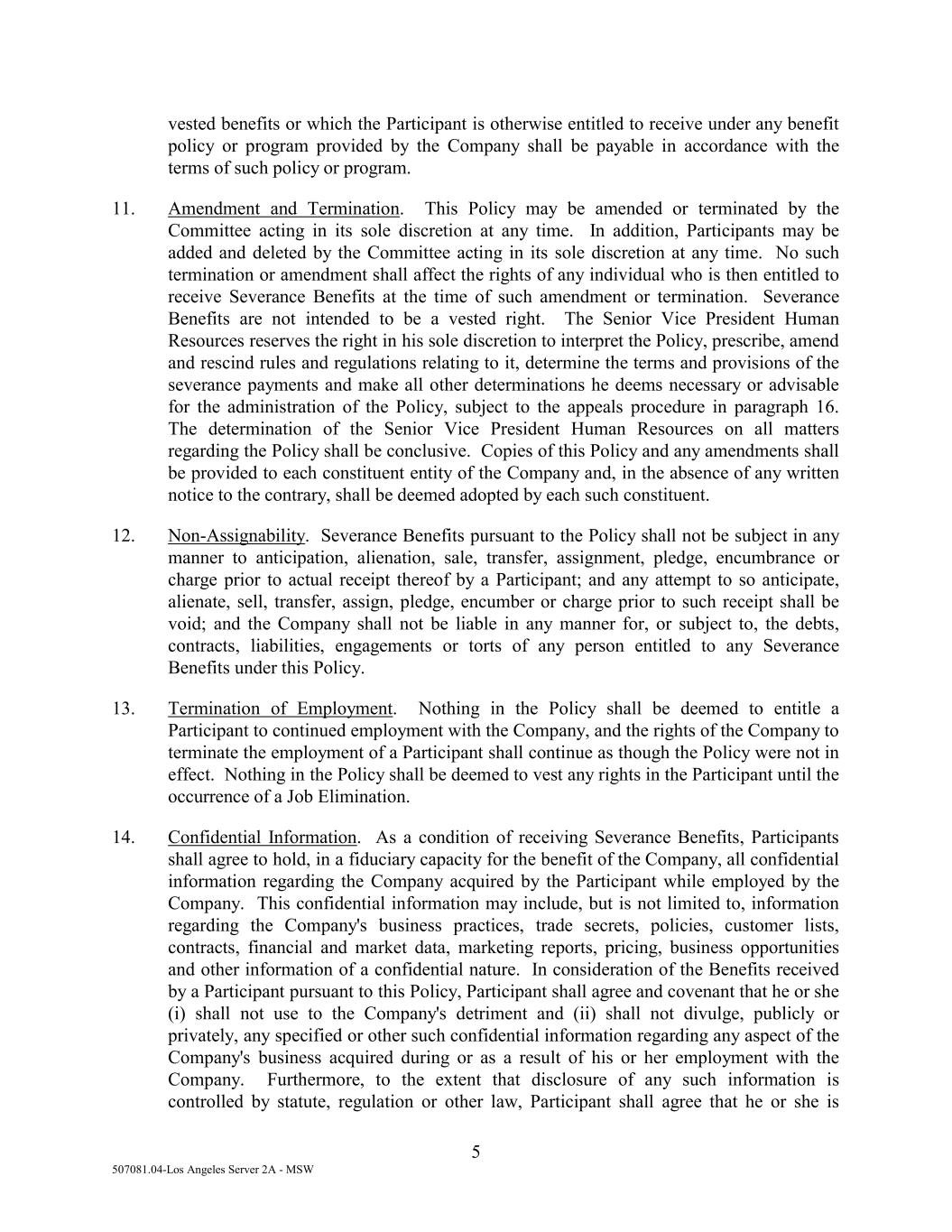 5 507081.04-Los Angeles Server 2A - MSW vested benefits or which the Participant is otherwise entitled to receive under any benefit policy or program provided by the Company shall be payable in accordance with the terms of such policy or program. 11. Amendment and Termination. This Policy may be amended or terminated by the Committee acting in its sole discretion at any time. In addition, Participants may be added and deleted by the Committee acting in its sole discretion at any time. No such termination or amendment shall affect the rights of any individual who is then entitled to receive Severance Benefits at the time of such amendment or termination. Severance Benefits are not intended to be a vested right. The Senior Vice President Human Resources reserves the right in his sole discretion to interpret the Policy, prescribe, amend and rescind rules and regulations relating to it, determine the terms and provisions of the severance payments and make all other determinations he deems necessary or advisable for the administration of the Policy, subject to the appeals procedure in paragraph 16. The determination of the Senior Vice President Human Resources on all matters regarding the Policy shall be conclusive. Copies of this Policy and any amendments shall be provided to each constituent entity of the Company and, in the absence of any written notice to the contrary, shall be deemed adopted by each such constituent. 12. Non-Assignability. Severance Benefits pursuant to the Policy shall not be subject in any manner to anticipation, alienation, sale, transfer, assignment, pledge, encumbrance or charge prior to actual receipt thereof by a Participant; and any attempt to so anticipate, alienate, sell, transfer, assign, pledge, encumber or charge prior to such receipt shall be void; and the Company shall not be liable in any manner for, or subject to, the debts, contracts, liabilities, engagements or torts of any person entitled to any Severance Benefits under this Policy. 13. Termination of Employment. Nothing in the Policy shall be deemed to entitle a Participant to continued employment with the Company, and the rights of the Company to terminate the employment of a Participant shall continue as though the Policy were not in effect. Nothing in the Policy shall be deemed to vest any rights in the Participant until the occurrence of a Job Elimination. 14. Confidential Information. As a condition of receiving Severance Benefits, Participants shall agree to hold, in a fiduciary capacity for the benefit of the Company, all confidential information regarding the Company acquired by the Participant while employed by the Company. This confidential information may include, but is not limited to, information regarding the Company's business practices, trade secrets, policies, customer lists, contracts, financial and market data, marketing reports, pricing, business opportunities and other information of a confidential nature. In consideration of the Benefits received by a Participant pursuant to this Policy, Participant shall agree and covenant that he or she (i) shall not use to the Company's detriment and (ii) shall not divulge, publicly or privately, any specified or other such confidential information regarding any aspect of the Company's business acquired during or as a result of his or her employment with the Company. Furthermore, to the extent that disclosure of any such information is controlled by statute, regulation or other law, Participant shall agree that he or she is