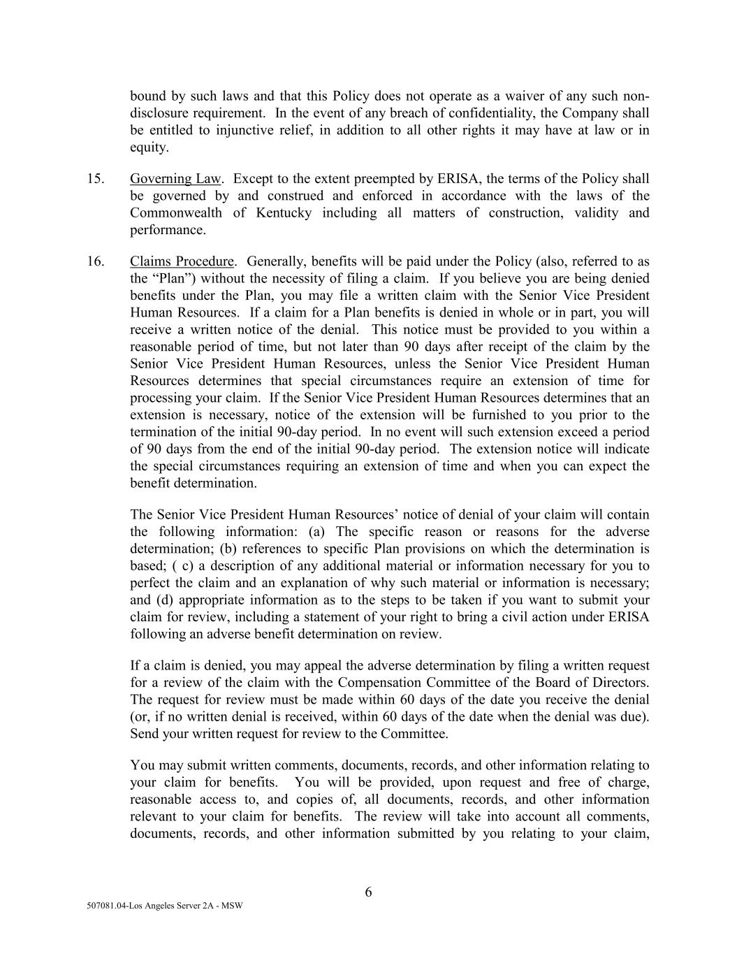 6 507081.04-Los Angeles Server 2A - MSW bound by such laws and that this Policy does not operate as a waiver of any such non- disclosure requirement. In the event of any breach of confidentiality, the Company shall be entitled to injunctive relief, in addition to all other rights it may have at law or in equity. 15. Governing Law. Except to the extent preempted by ERISA, the terms of the Policy shall be governed by and construed and enforced in accordance with the laws of the Commonwealth of Kentucky including all matters of construction, validity and performance. 16. Claims Procedure. Generally, benefits will be paid under the Policy (also, referred to as the “Plan”) without the necessity of filing a claim. If you believe you are being denied benefits under the Plan, you may file a written claim with the Senior Vice President Human Resources. If a claim for a Plan benefits is denied in whole or in part, you will receive a written notice of the denial. This notice must be provided to you within a reasonable period of time, but not later than 90 days after receipt of the claim by the Senior Vice President Human Resources, unless the Senior Vice President Human Resources determines that special circumstances require an extension of time for processing your claim. If the Senior Vice President Human Resources determines that an extension is necessary, notice of the extension will be furnished to you prior to the termination of the initial 90-day period. In no event will such extension exceed a period of 90 days from the end of the initial 90-day period. The extension notice will indicate the special circumstances requiring an extension of time and when you can expect the benefit determination. The Senior Vice President Human Resources’ notice of denial of your claim will contain the following information: (a) The specific reason or reasons for the adverse determination; (b) references to specific Plan provisions on which the determination is based; ( c) a description of any additional material or information necessary for you to perfect the claim and an explanation of why such material or information is necessary; and (d) appropriate information as to the steps to be taken if you want to submit your claim for review, including a statement of your right to bring a civil action under ERISA following an adverse benefit determination on review. If a claim is denied, you may appeal the adverse determination by filing a written request for a review of the claim with the Compensation Committee of the Board of Directors. The request for review must be made within 60 days of the date you receive the denial (or, if no written denial is received, within 60 days of the date when the denial was due). Send your written request for review to the Committee. You may submit written comments, documents, records, and other information relating to your claim for benefits. You will be provided, upon request and free of charge, reasonable access to, and copies of, all documents, records, and other information relevant to your claim for benefits. The review will take into account all comments, documents, records, and other information submitted by you relating to your claim,