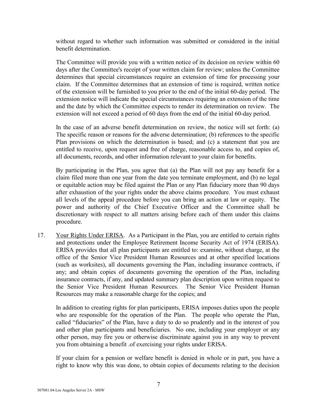 7 507081.04-Los Angeles Server 2A - MSW without regard to whether such information was submitted or considered in the initial benefit determination. The Committee will provide you with a written notice of its decision on review within 60 days after the Committee's receipt of your written claim for review; unless the Committee determines that special circumstances require an extension of time for processing your claim. If the Committee determines that an extension of time is required, written notice of the extension will be furnished to you prior to the end of the initial 60-day period. The extension notice will indicate the special circumstances requiring an extension of the time and the date by which the Committee expects to render its determination on review. The extension will not exceed a period of 60 days from the end of the initial 60-day period. In the case of an adverse benefit determination on review, the notice will set forth: (a) The specific reason or reasons for the adverse determination; (b) references to the specific Plan provisions on which the determination is based; and (c) a statement that you are entitled to receive, upon request and free of charge, reasonable access to, and copies of, all documents, records, and other information relevant to your claim for benefits. By participating in the Plan, you agree that (a) the Plan will not pay any benefit for a claim filed more than one year from the date you terminate employment, and (b) no legal or equitable action may be filed against the Plan or any Plan fiduciary more than 90 days after exhaustion of the your rights under the above claims procedure. You must exhaust all levels of the appeal procedure before you can bring an action at law or equity. The power and authority of the Chief Executive Officer and the Committee shall be discretionary with respect to all matters arising before each of them under this claims procedure. 17. Your Rights Under ERISA. As a Participant in the Plan, you are entitled to certain rights and protections under the Employee Retirement Income Security Act of 1974 (ERISA). ERISA provides that all plan participants are entitled to: examine, without charge, at the office of the Senior Vice President Human Resources and at other specified locations (such as worksites), all documents governing the Plan, including insurance contracts, if any; and obtain copies of documents governing the operation of the Plan, including insurance contracts, if any, and updated summary plan description upon written request to the Senior Vice President Human Resources. The Senior Vice President Human Resources may make a reasonable charge for the copies; and In addition to creating rights for plan participants, ERISA imposes duties upon the people who are responsible for the operation of the Plan. The people who operate the Plan, called “fiduciaries” of the Plan, have a duty to do so prudently and in the interest of you and other plan participants and beneficiaries. No one, including your employer or any other person, may fire you or otherwise discriminate against you in any way to prevent you from obtaining a benefit .of exercising your rights under ERISA. If your claim for a pension or welfare benefit is denied in whole or in part, you have a right to know why this was done, to obtain copies of documents relating to the decision